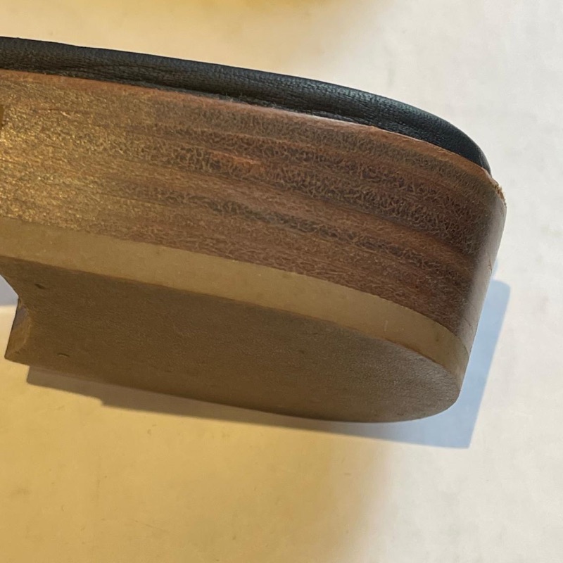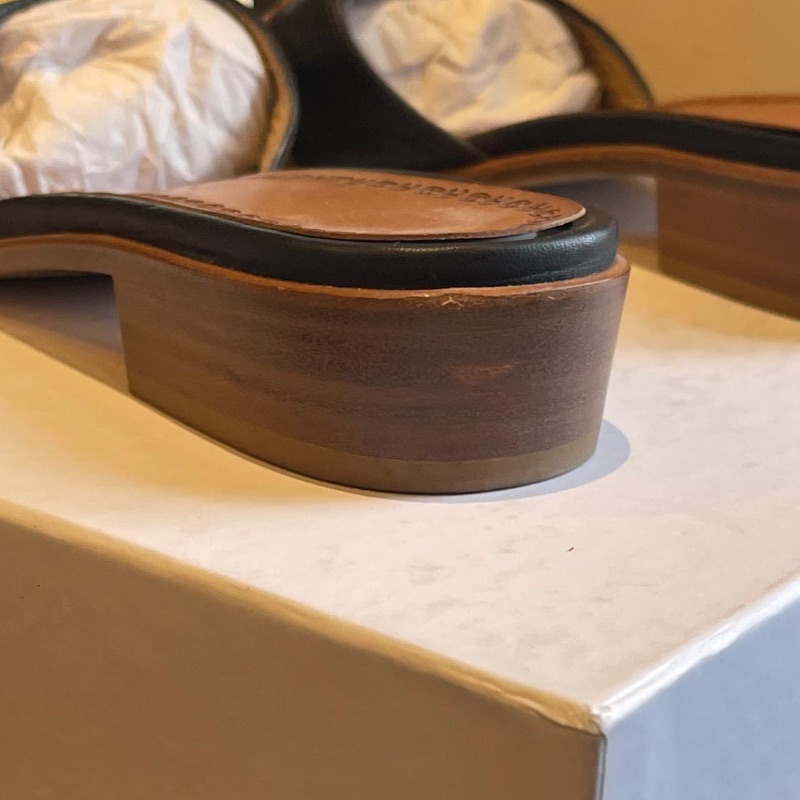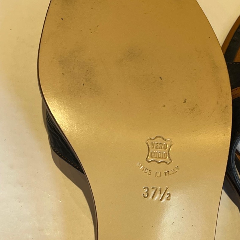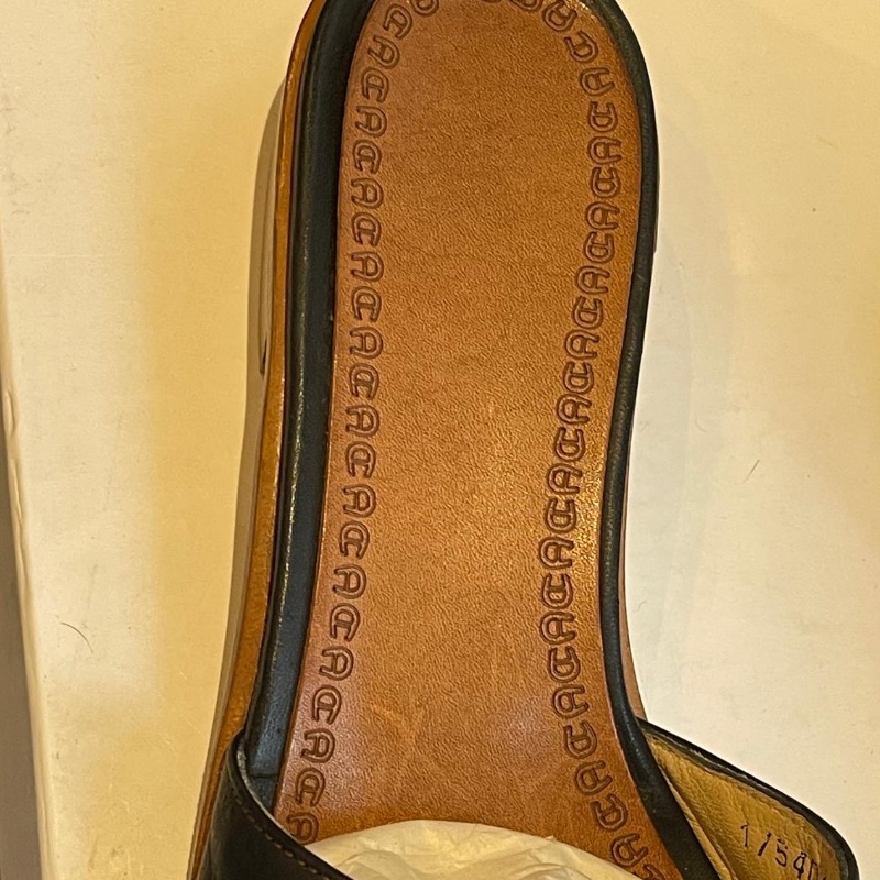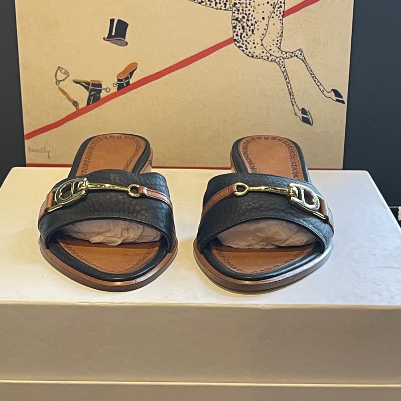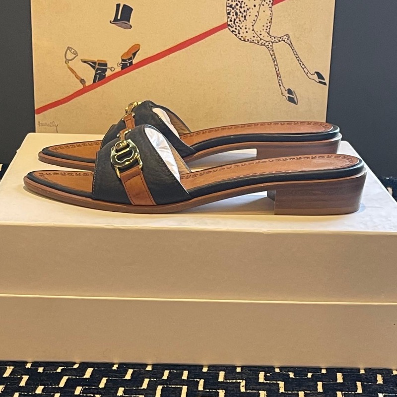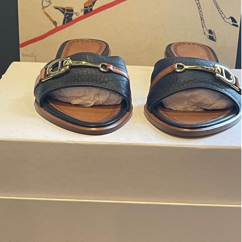 Designer leather thong sliders by Aigner. Different shades of brown with horsebit detail.