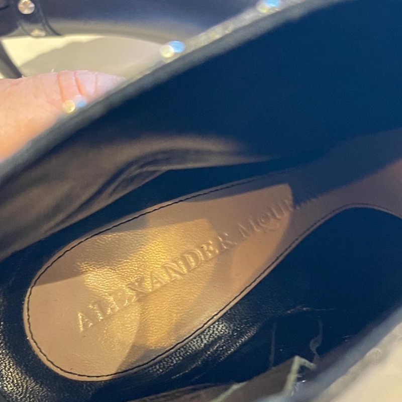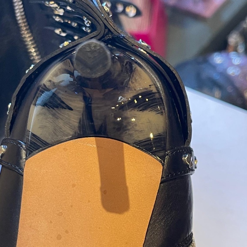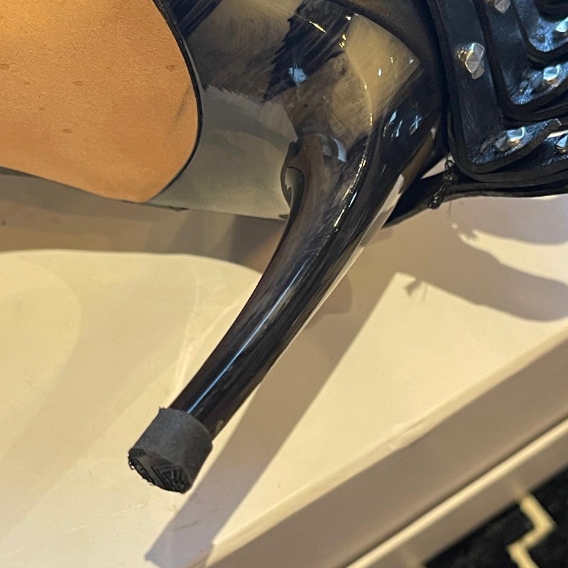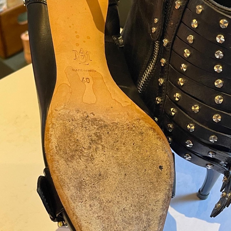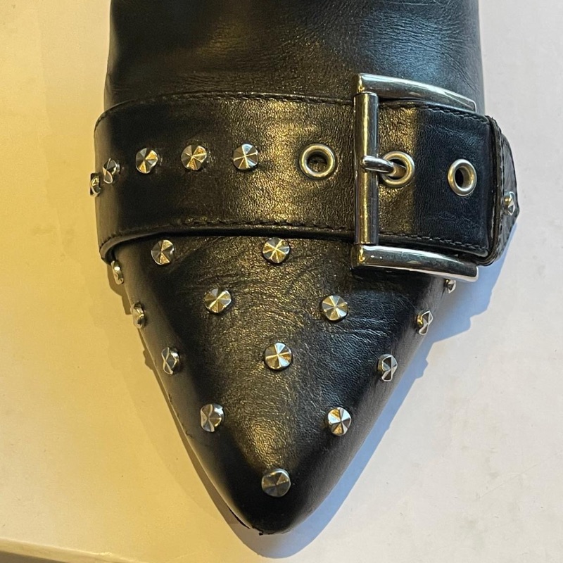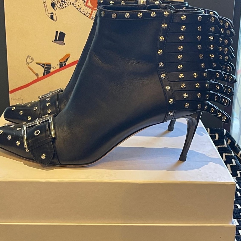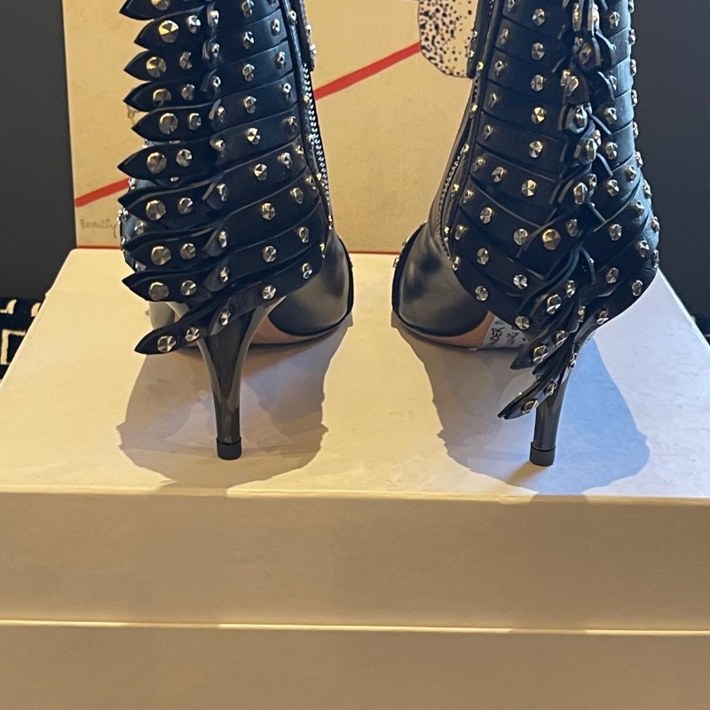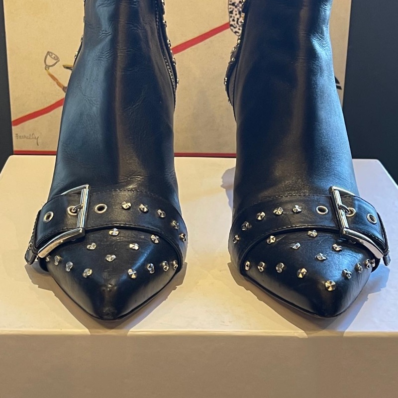 Black leather with studs and straps, side zip and 3” curved shaped heels.