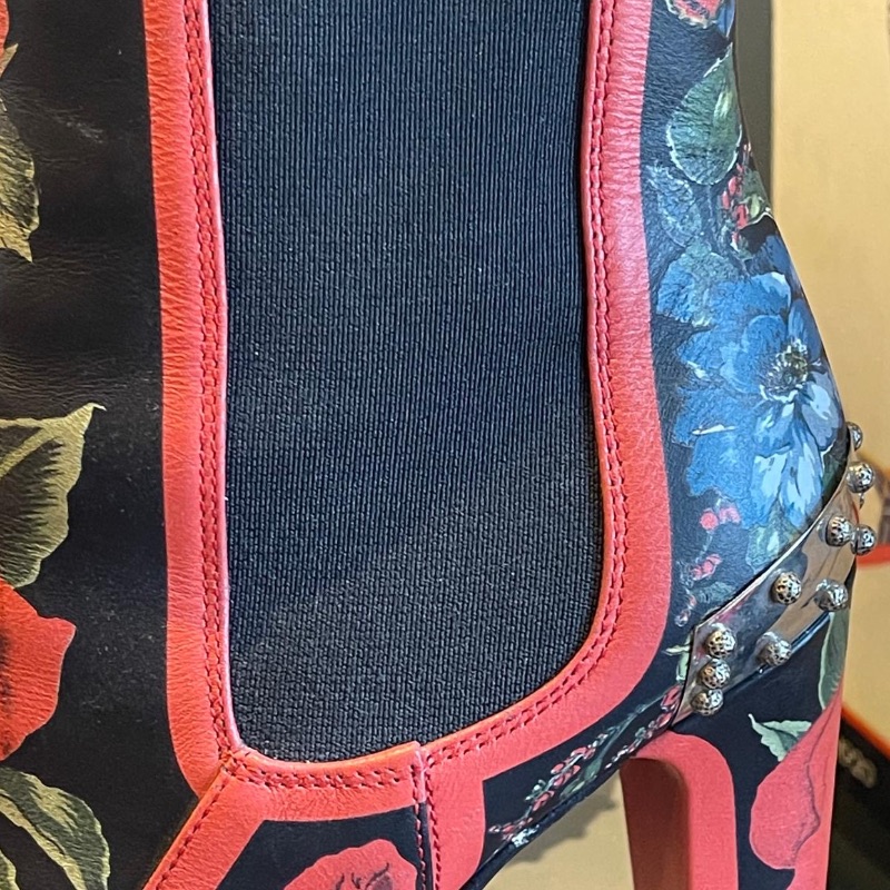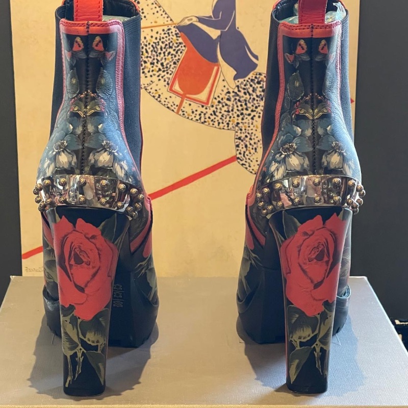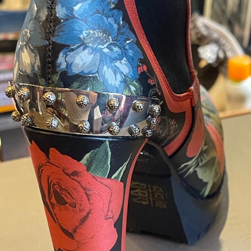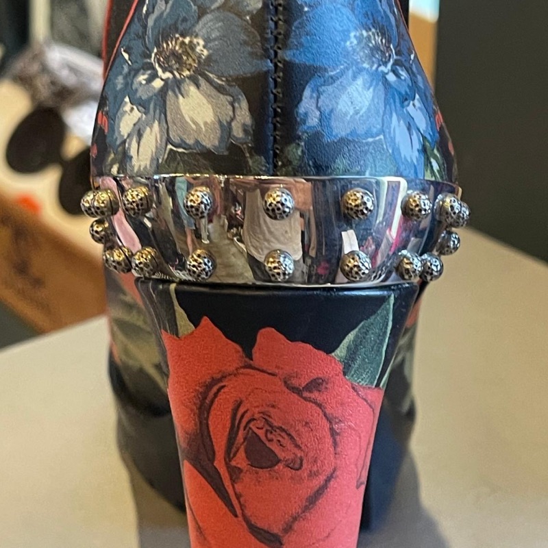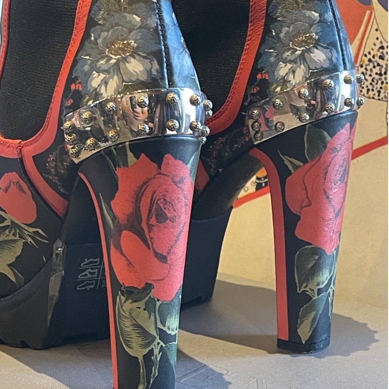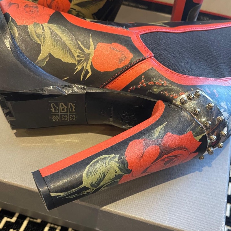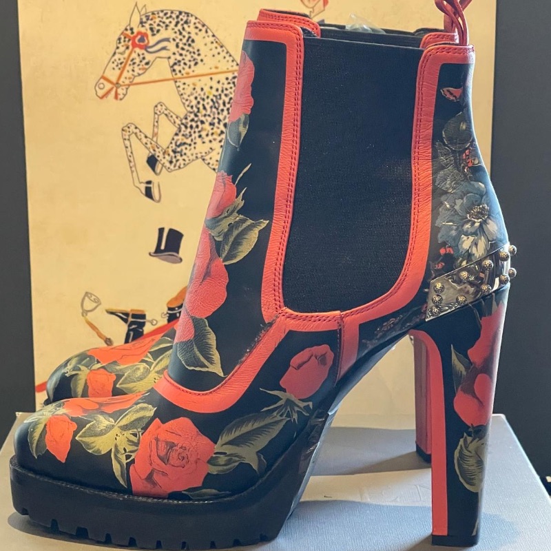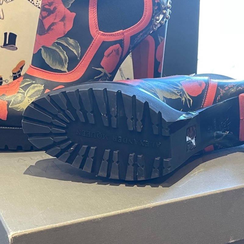 Alexander McQueen platform rubberised sole, pull on boots in gothic rose design with studs on the heels. These are stunning and in perfect condition.