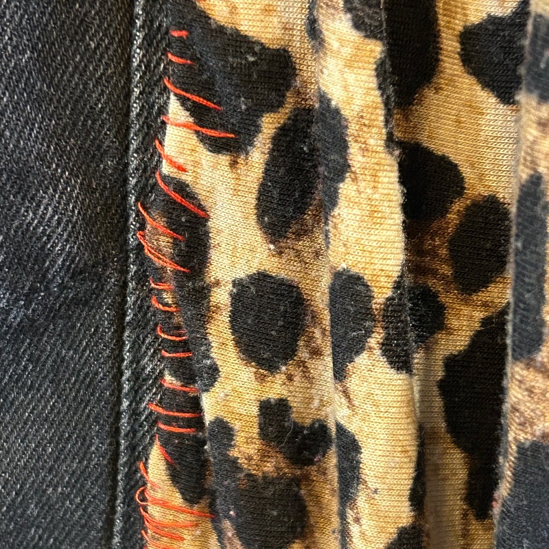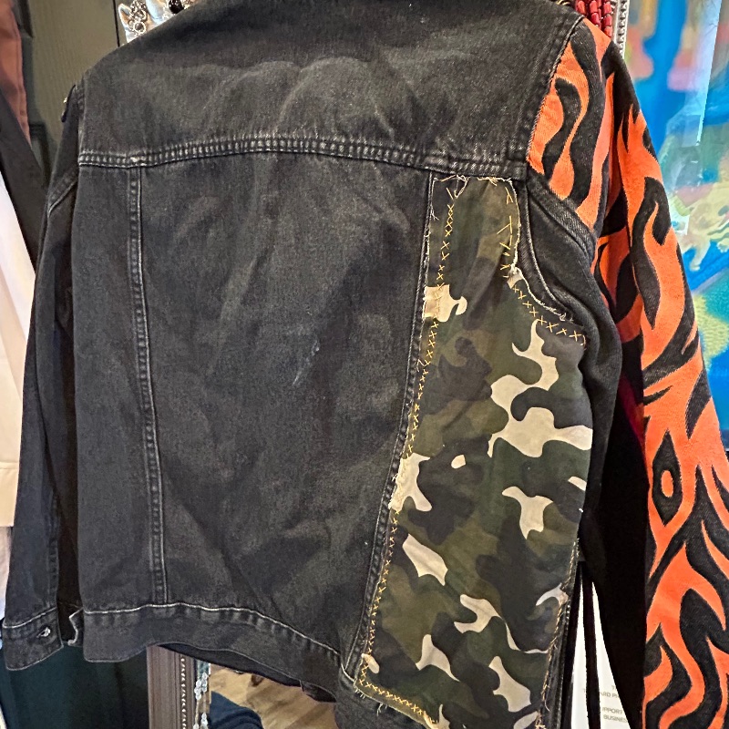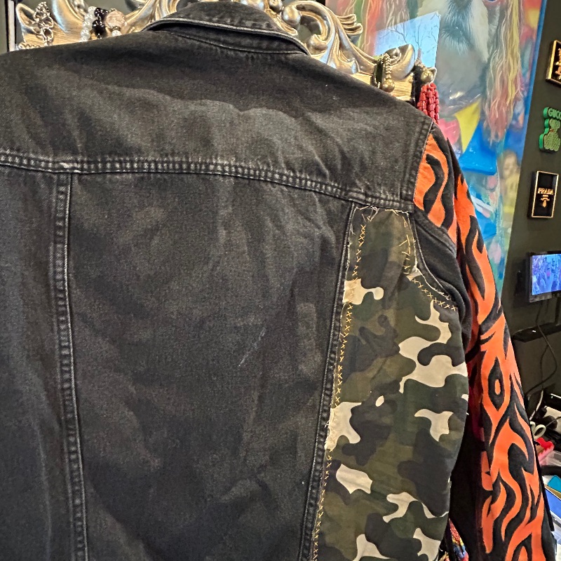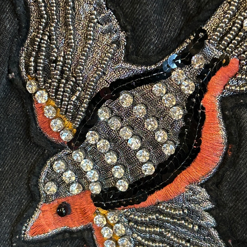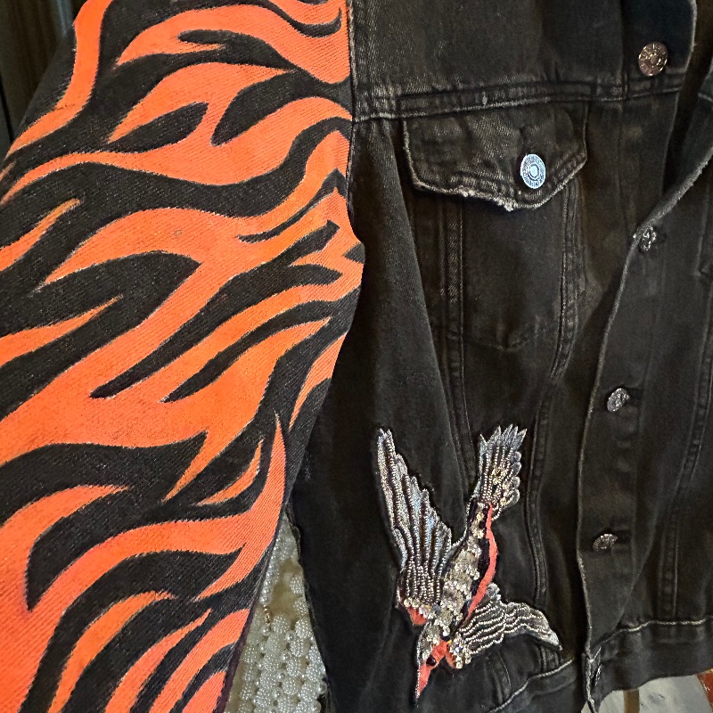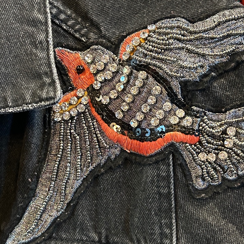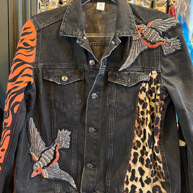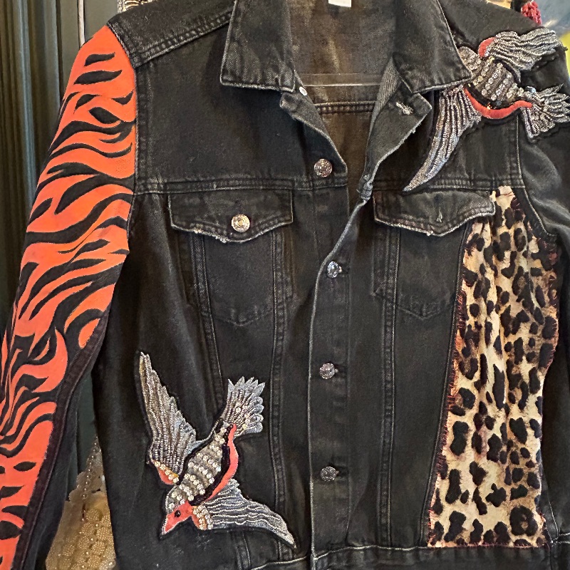 Funky denim jacket with animal print graphics and Diamante detailed birds.