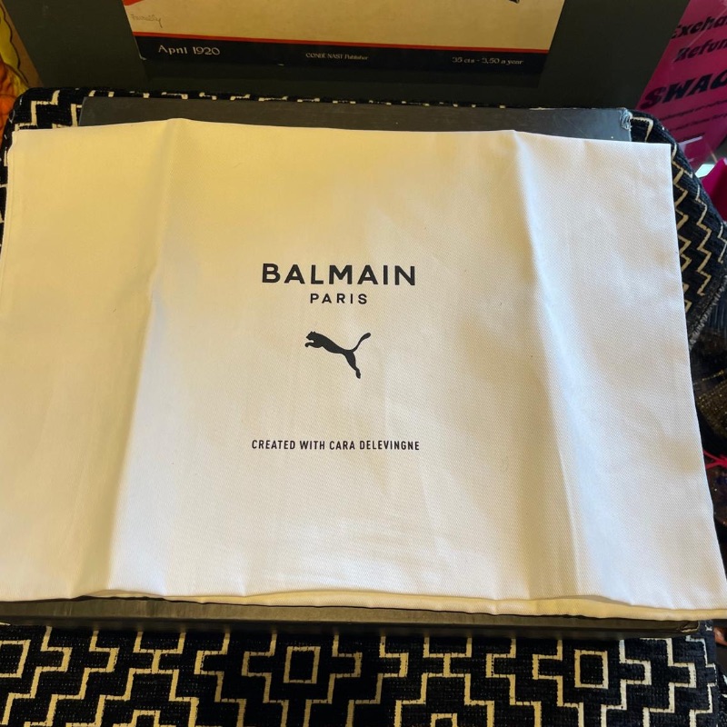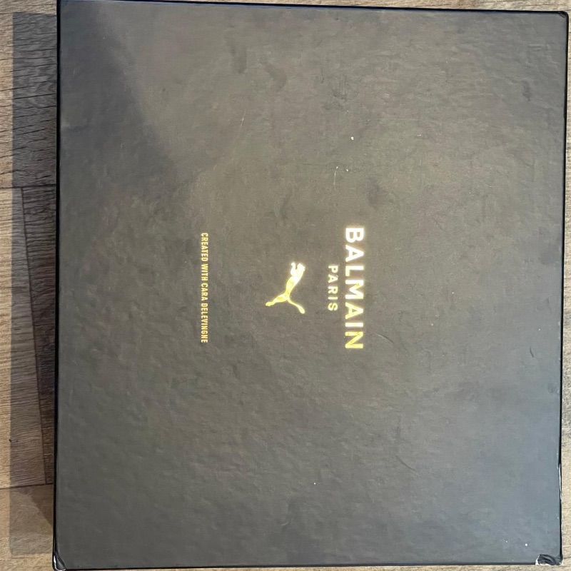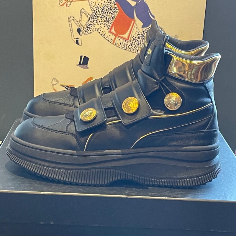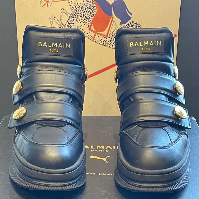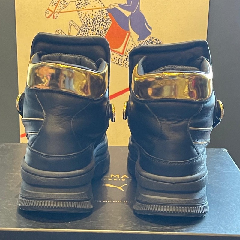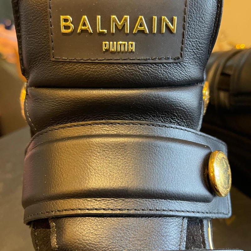 Leather ankle boots by Balmain. Black with gold accents and Velcro straps