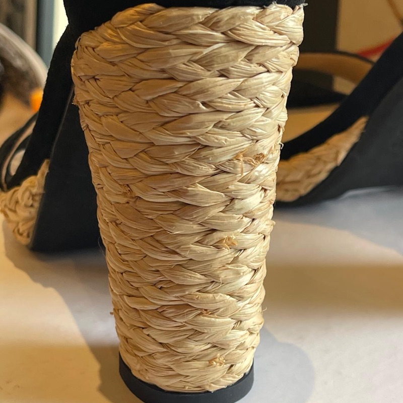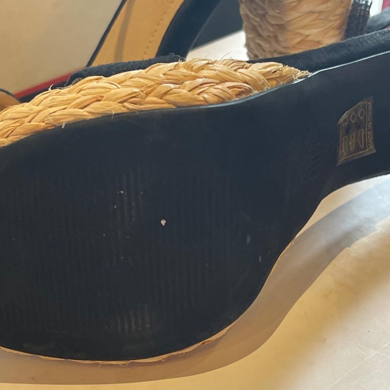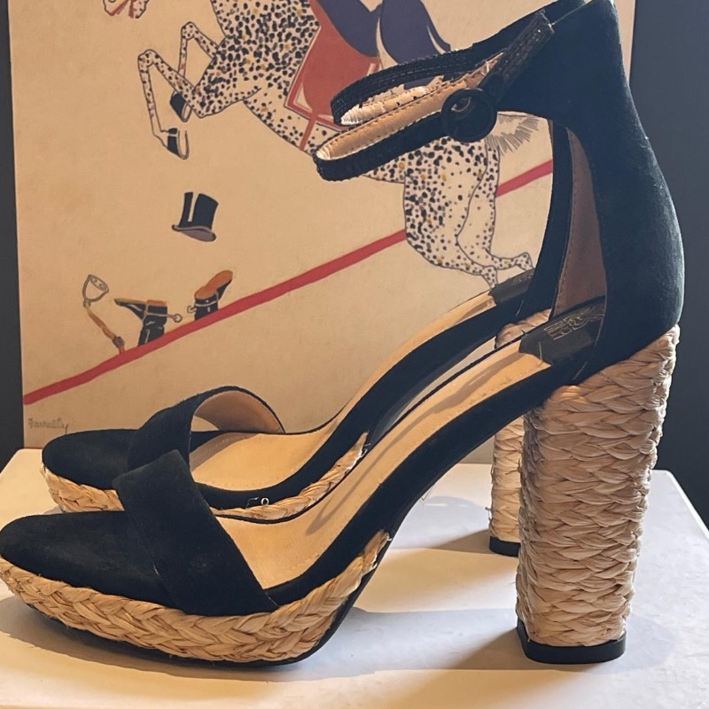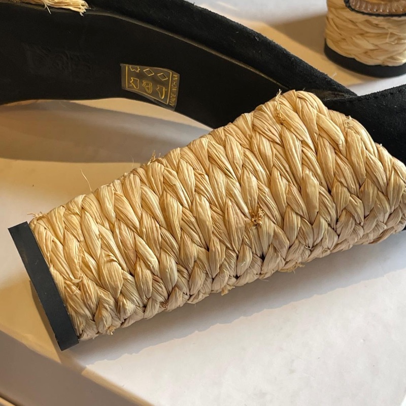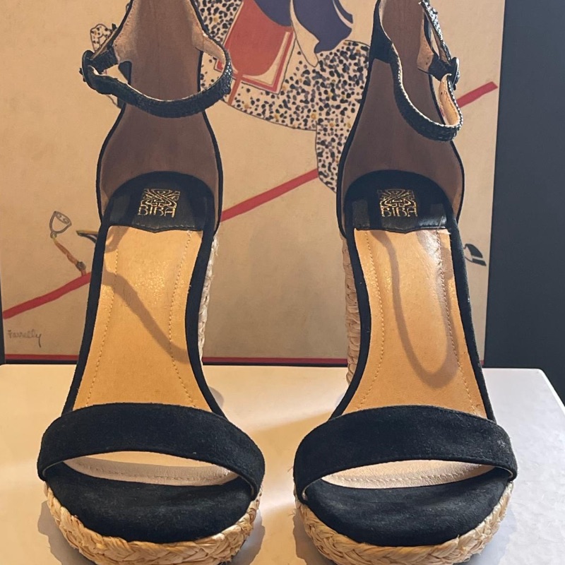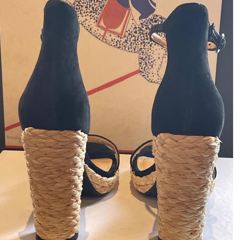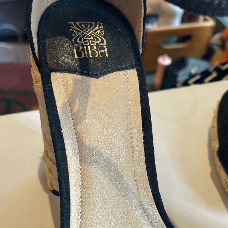 Legendary Biba sandals in black with contrasting wicker block heels.