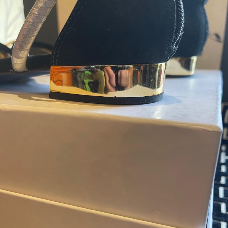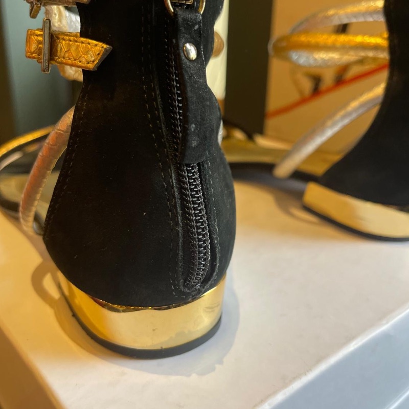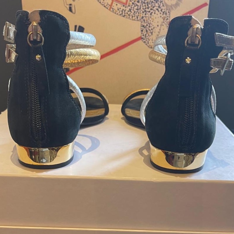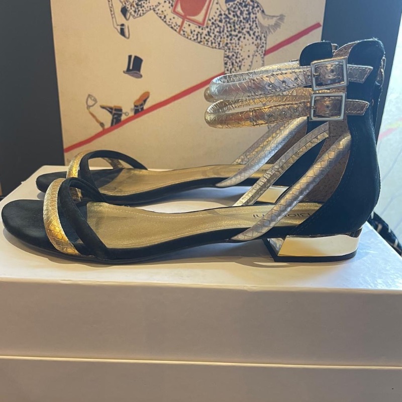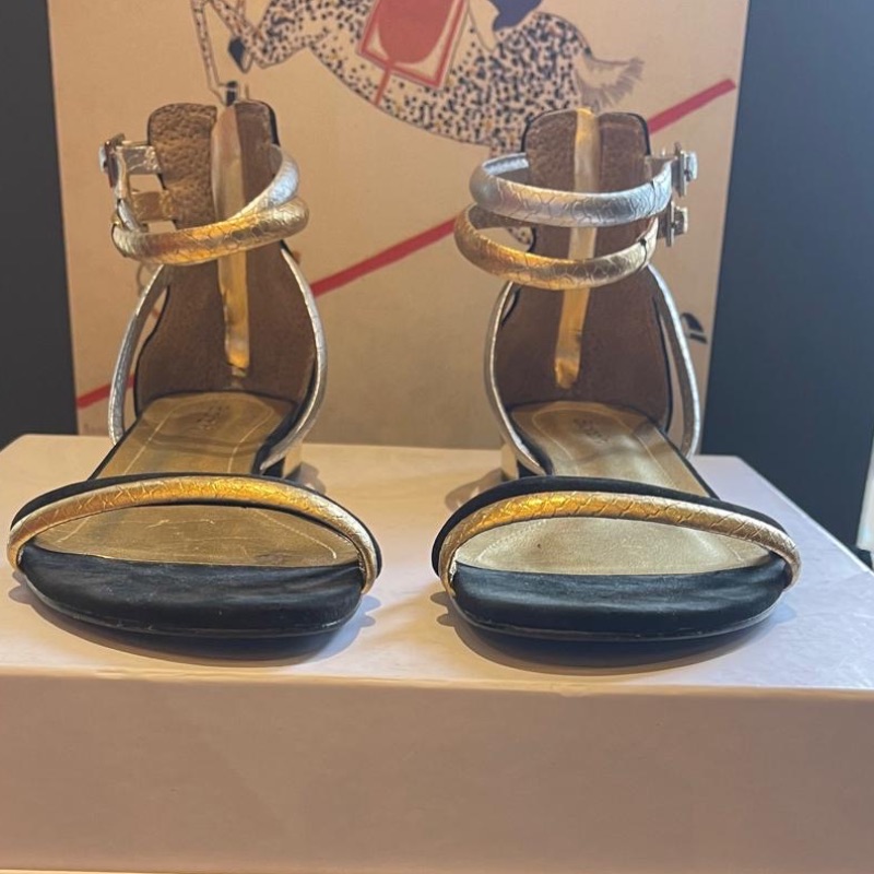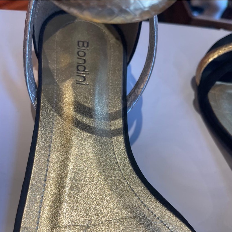 Cute little double ankle strap flat sandals by Biondini. A mixture of silver and gold with a mirror gold heel