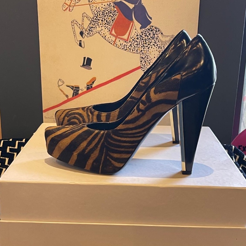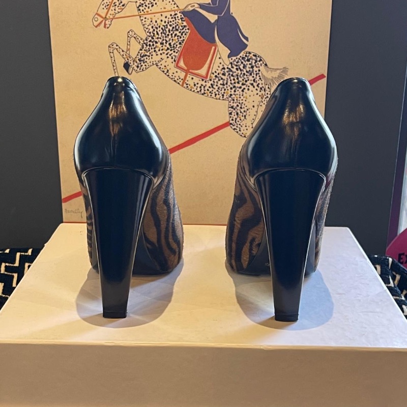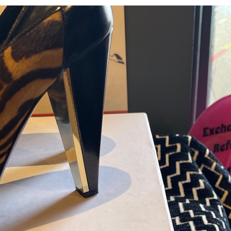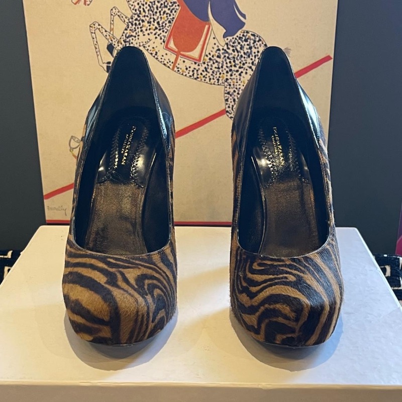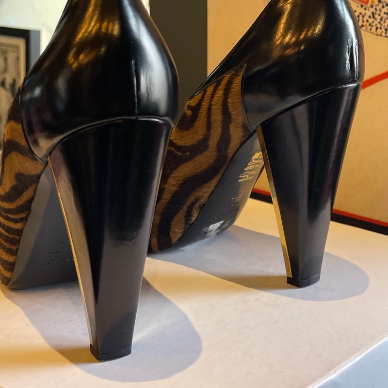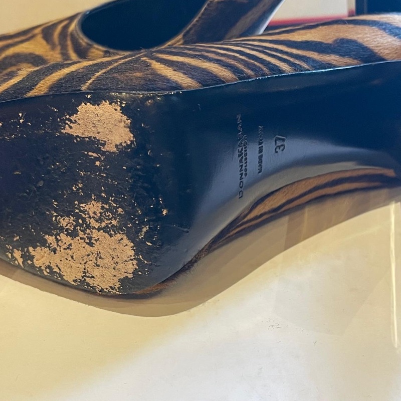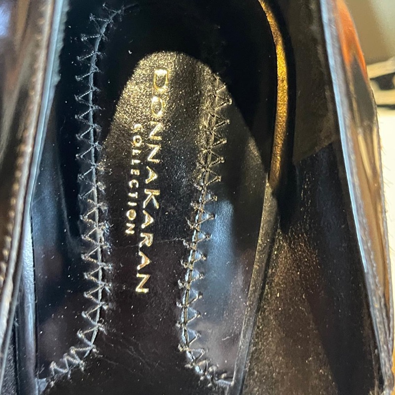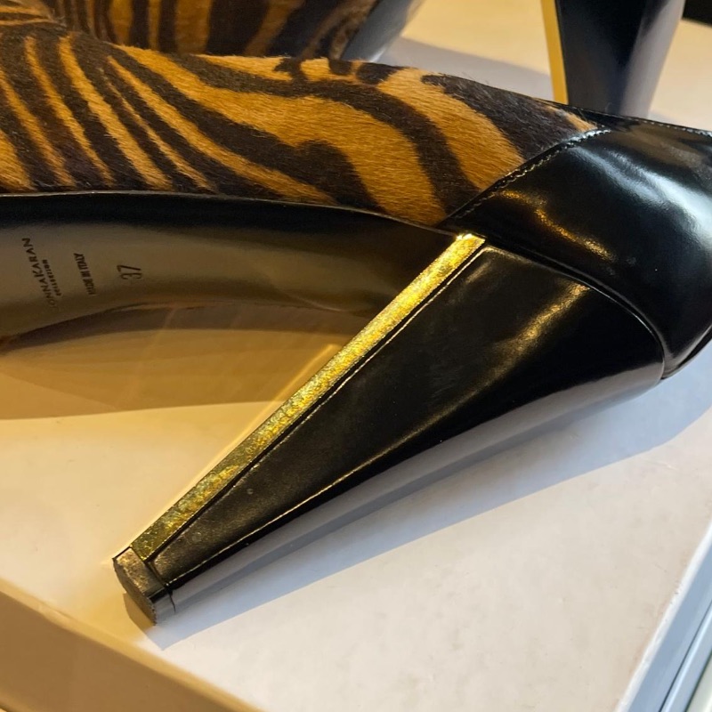 Very attractive shaped heels, all leather by DKNY. Heels have a contrasting mirrored edge