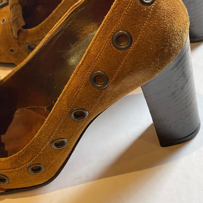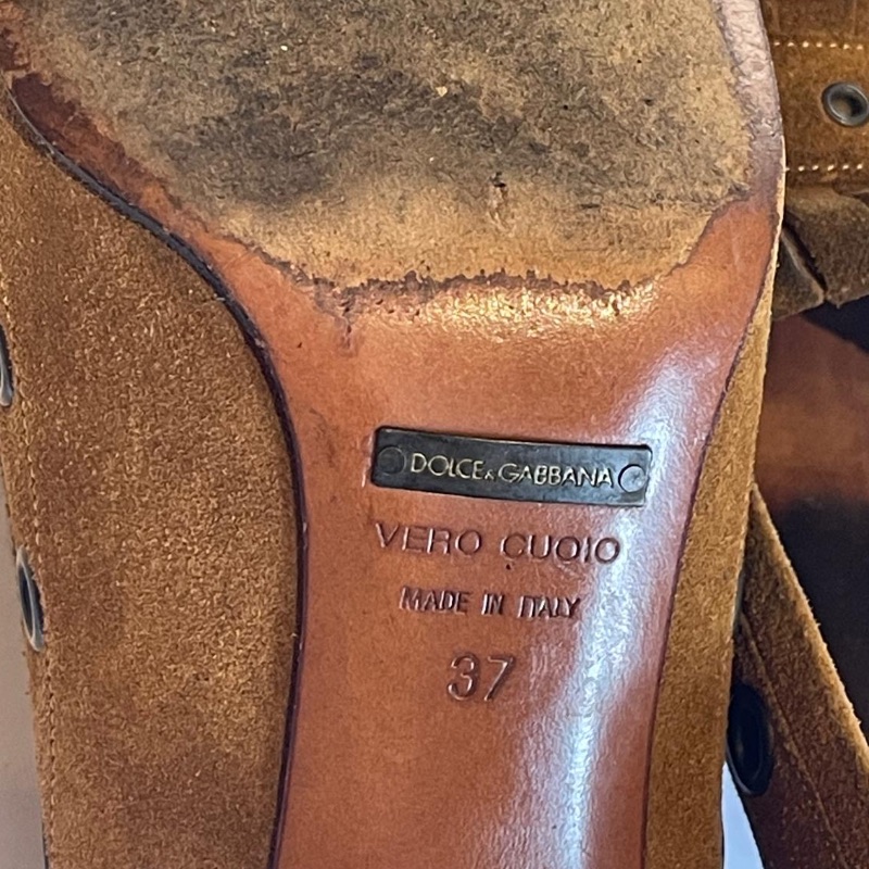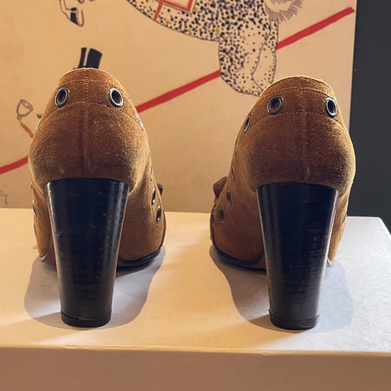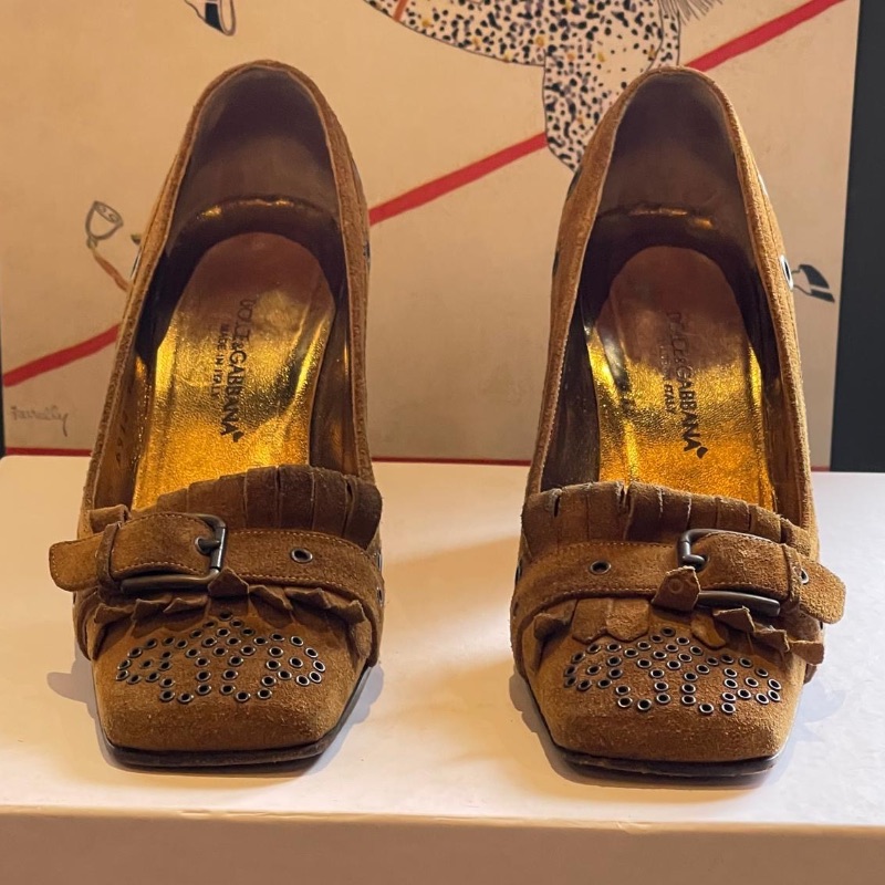 Dolce & Gabbana Brown suede court shoes with thick set heel, patterned stud design to toes, buckle and metal rings around the shoe.