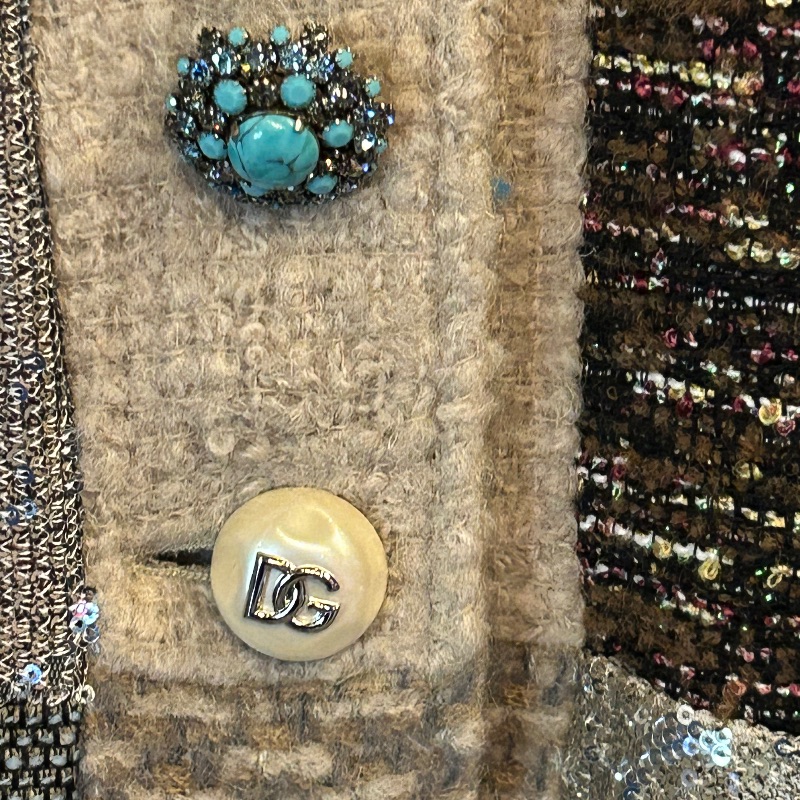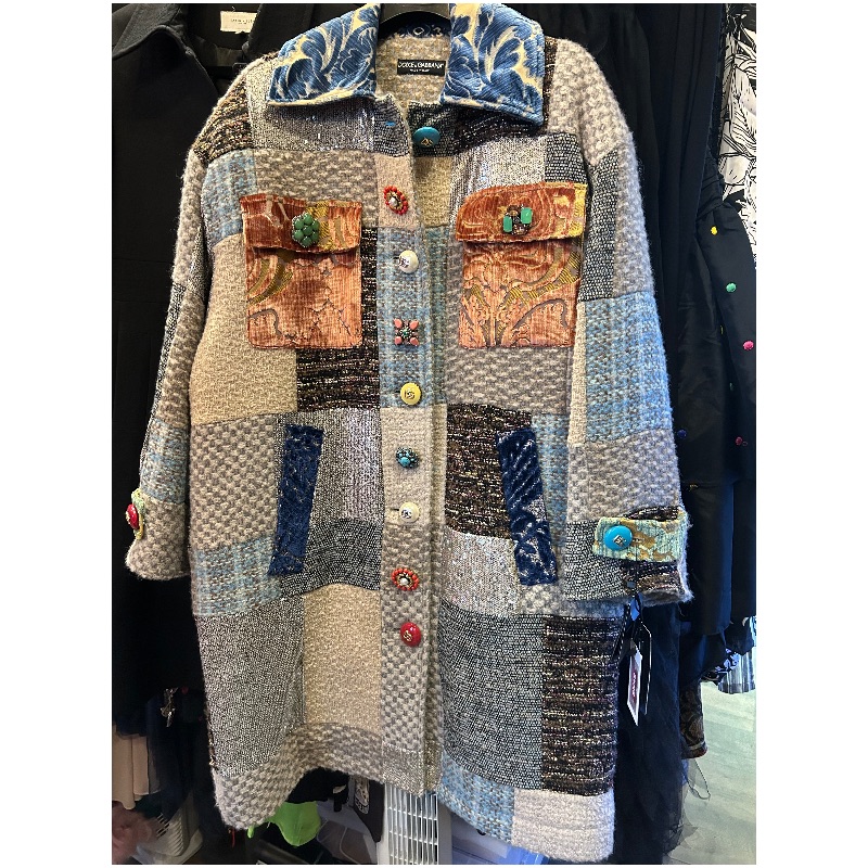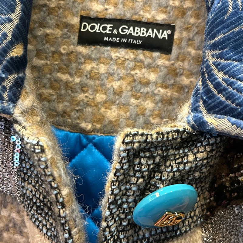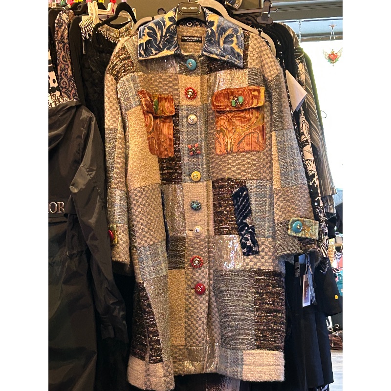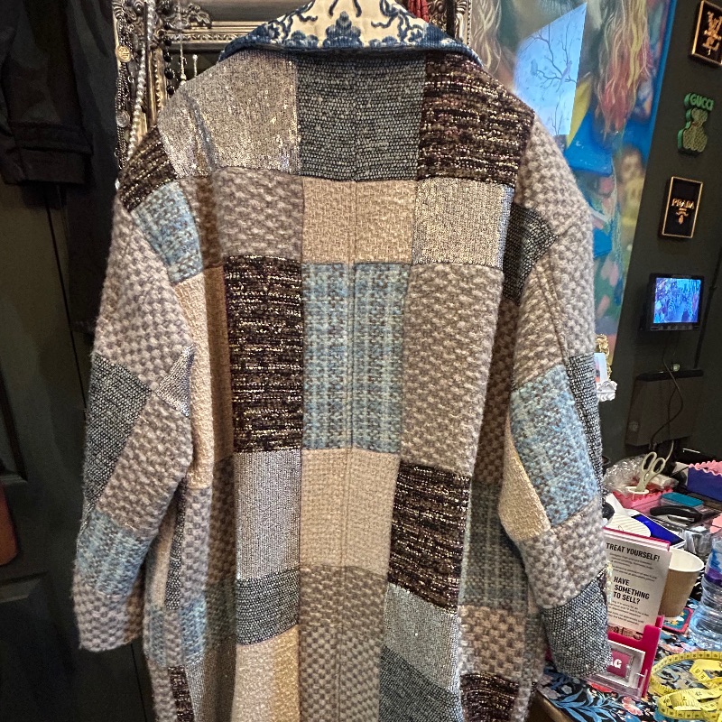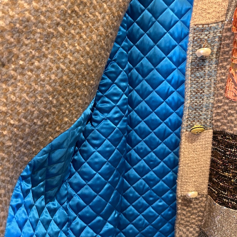 Made from merino and other wools, amazingly oversized with statement buttons, sequin panels and brocade velvet details. Electric blue silk lining - please study all photos