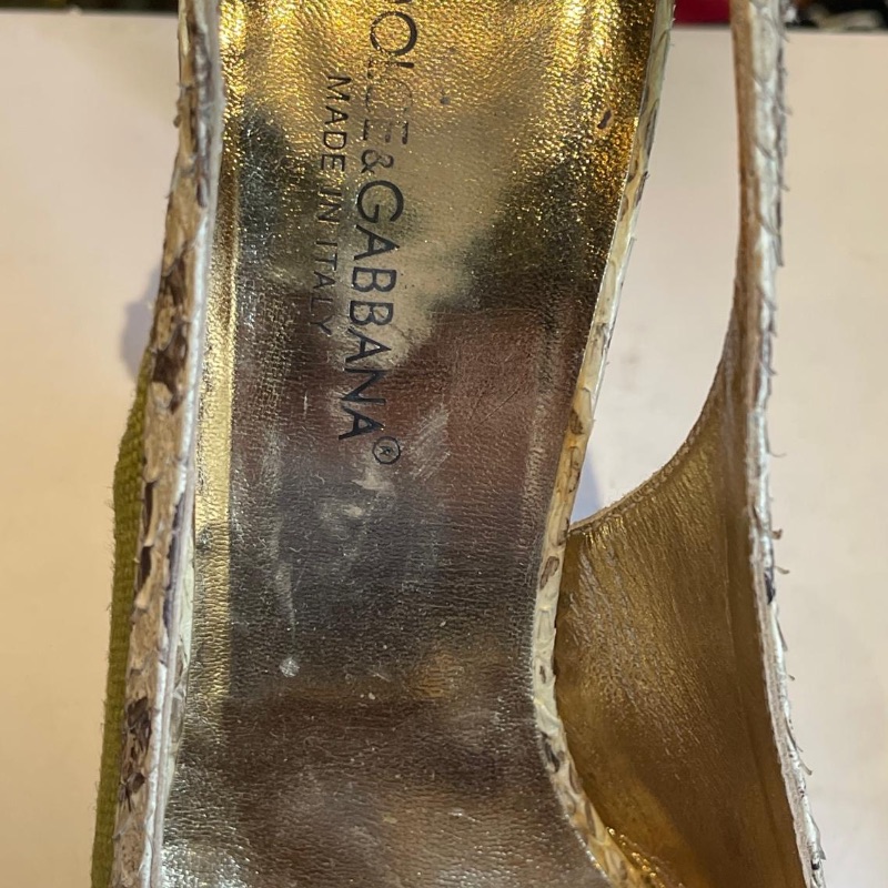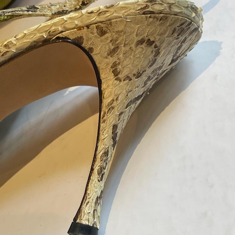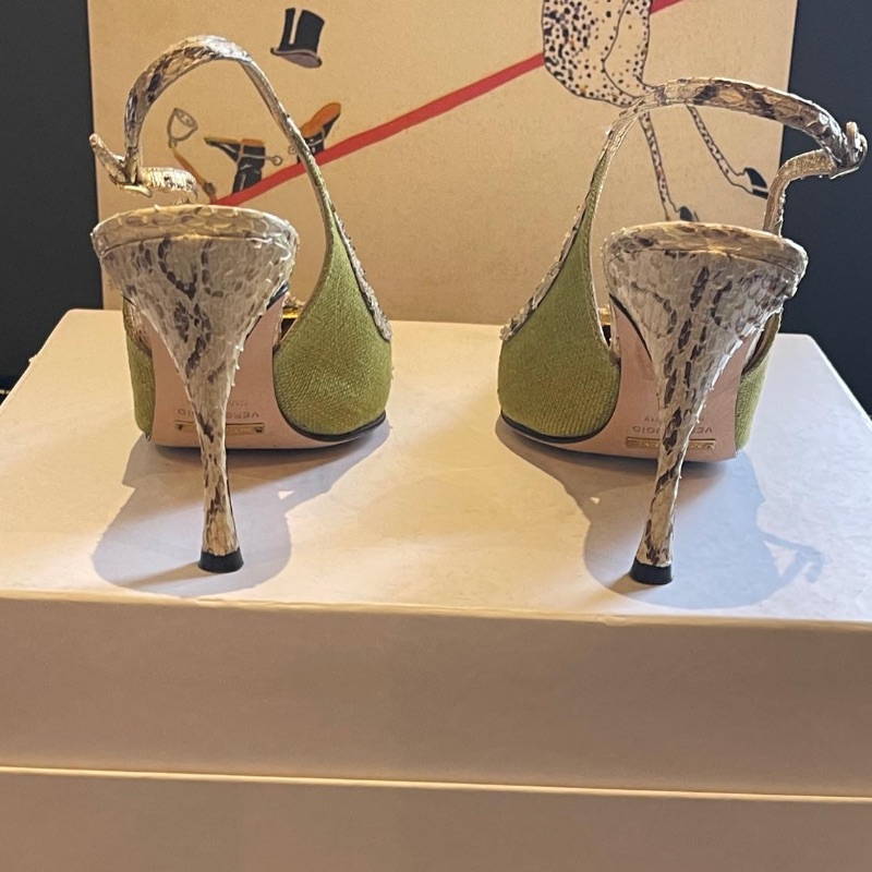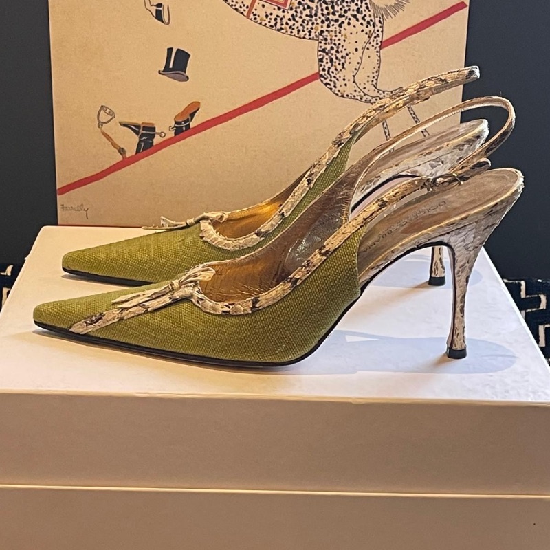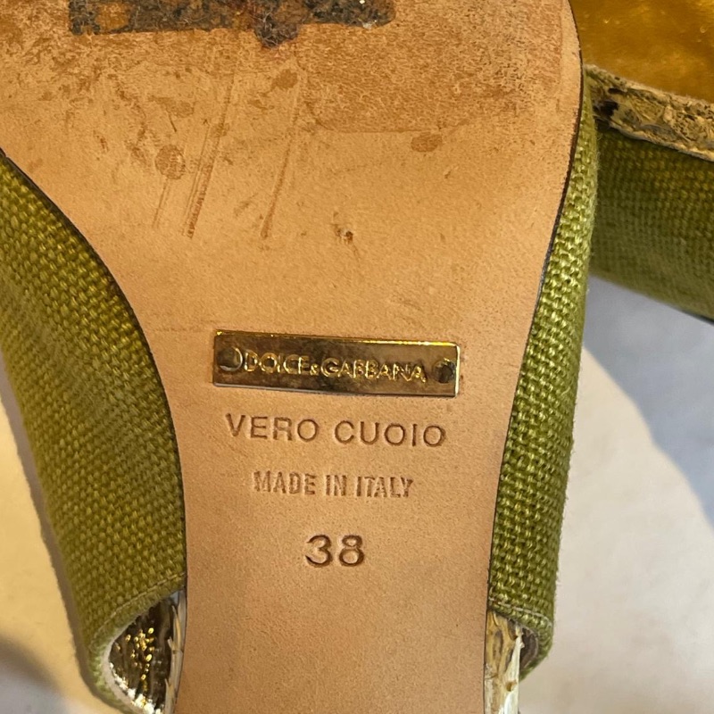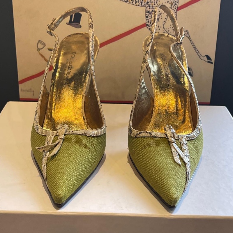 Stunning kitten heels in green canvas & leather trim by D&G. Snake pattern leather heel and matching bow at the front