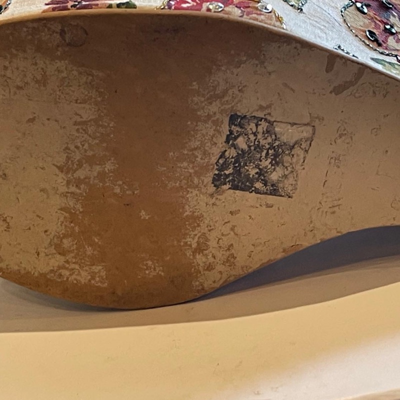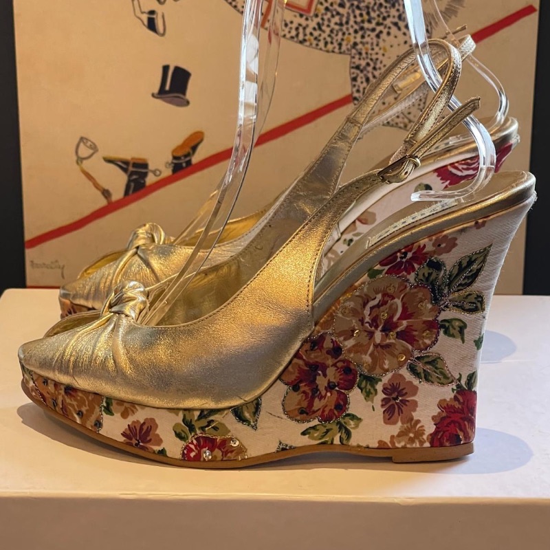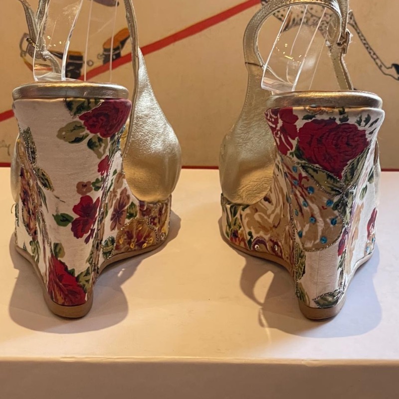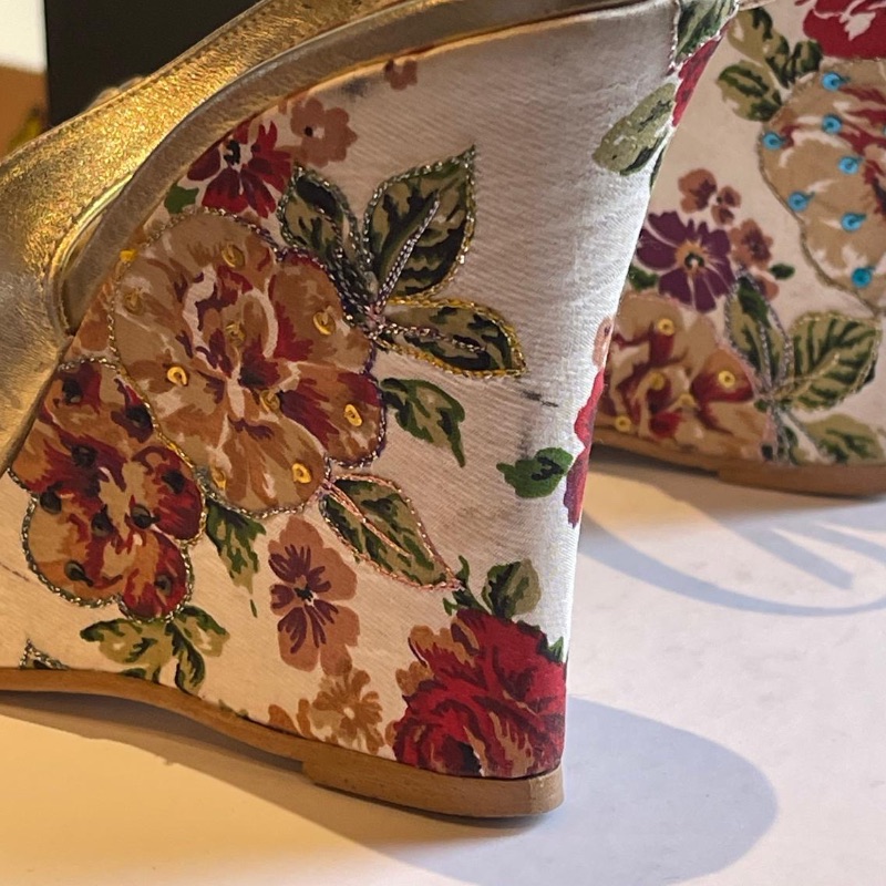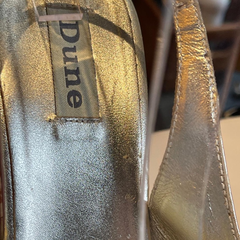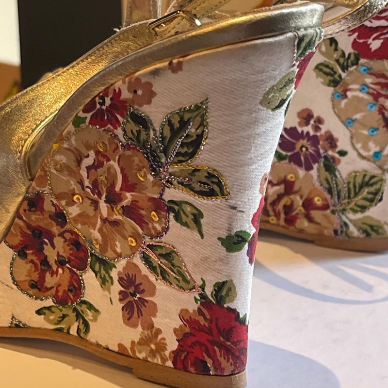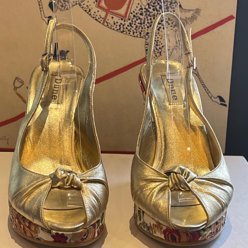 Dune gold wedges with a floral wedge and little sparkly sequin detail. Peeptoe & knot front