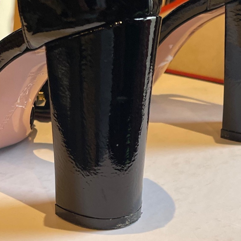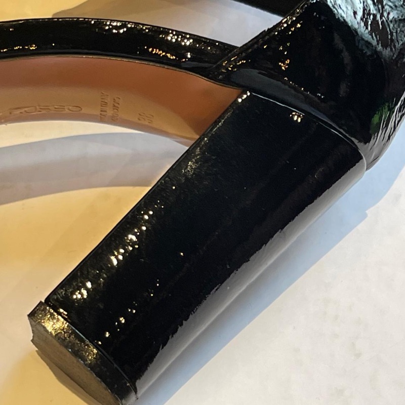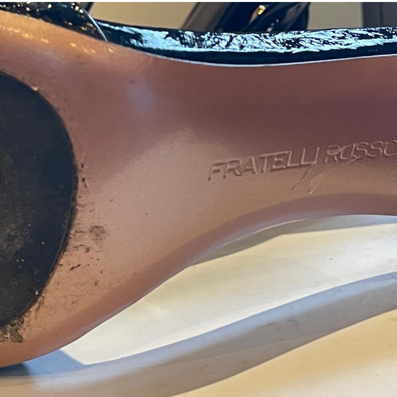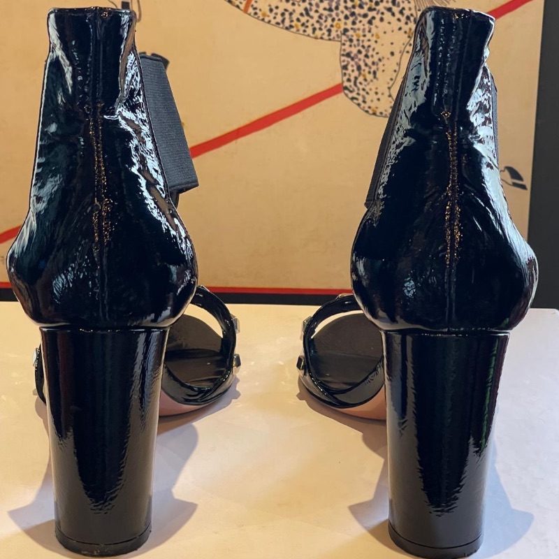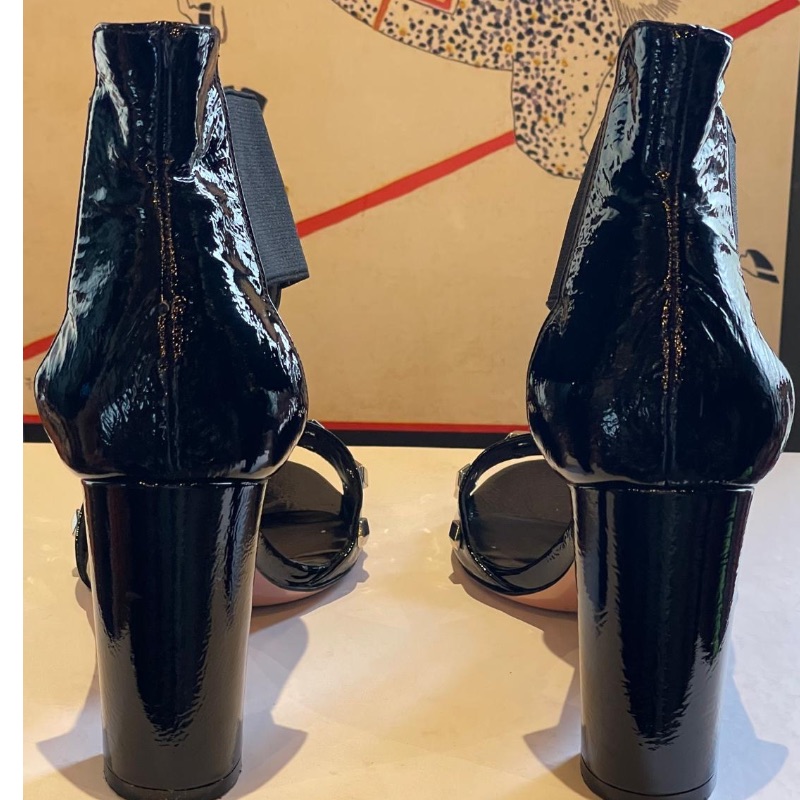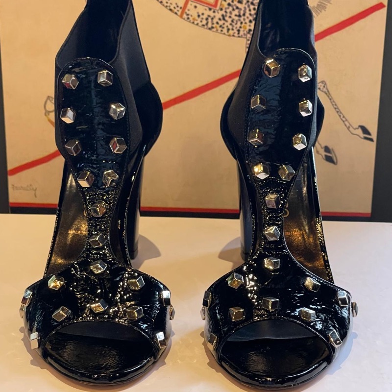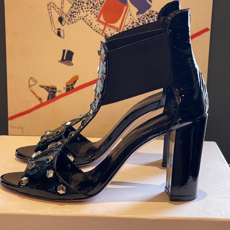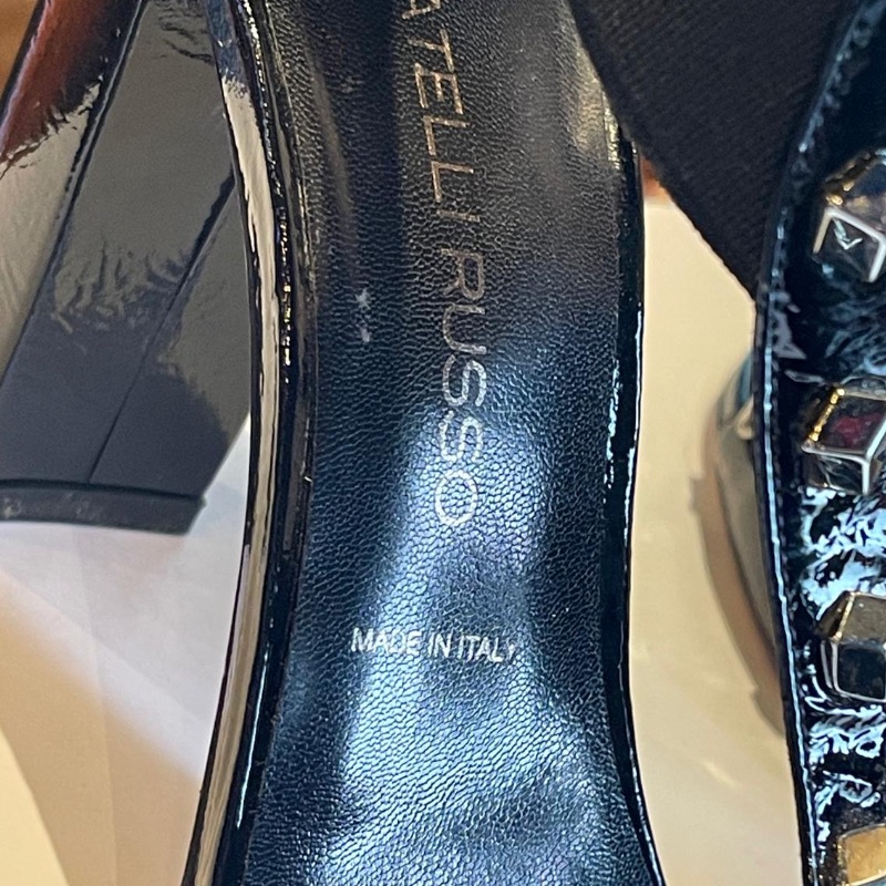 Designer Fratelli Russo patent leather sandal with elasticated ankle strap and studded detail.