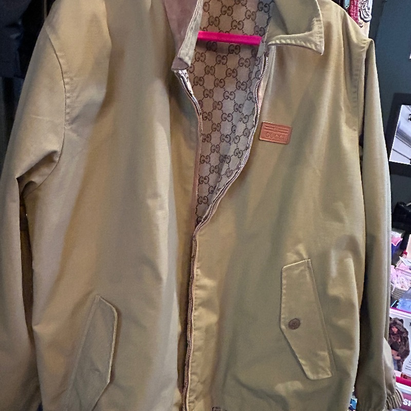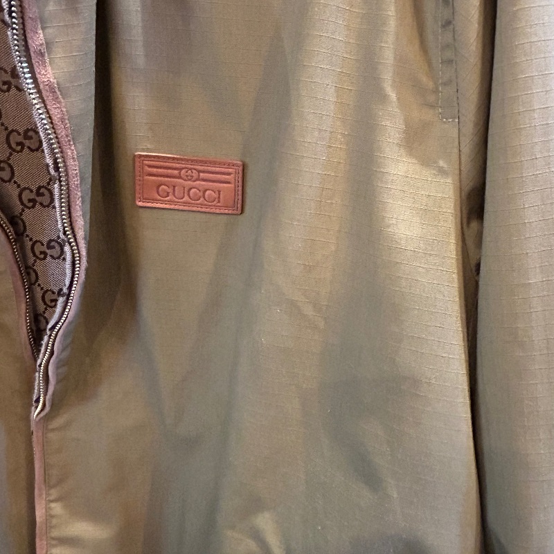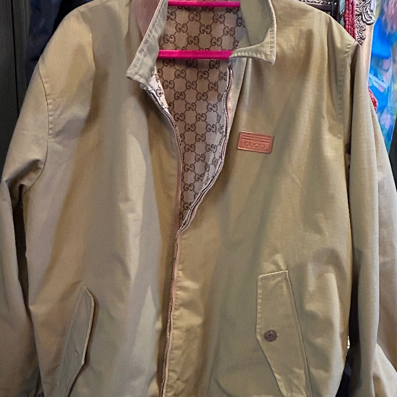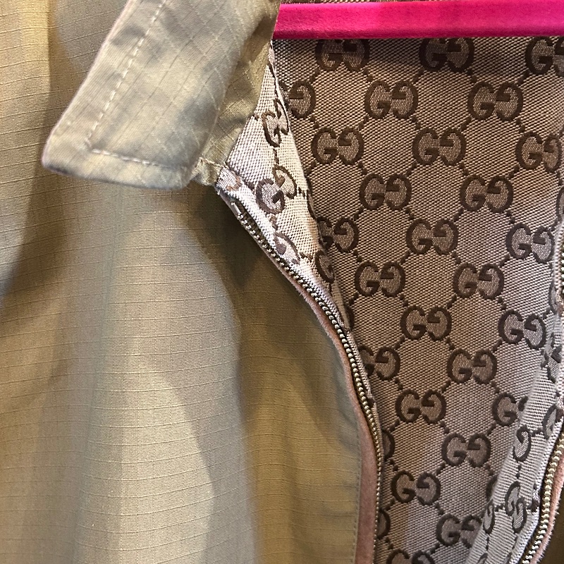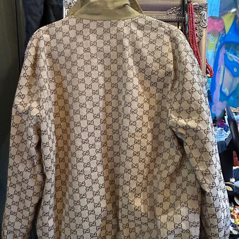 Unisex Gucci monogram jacket in Brown / Gold / Green colours. Totally reversible to a green canvas jacket.