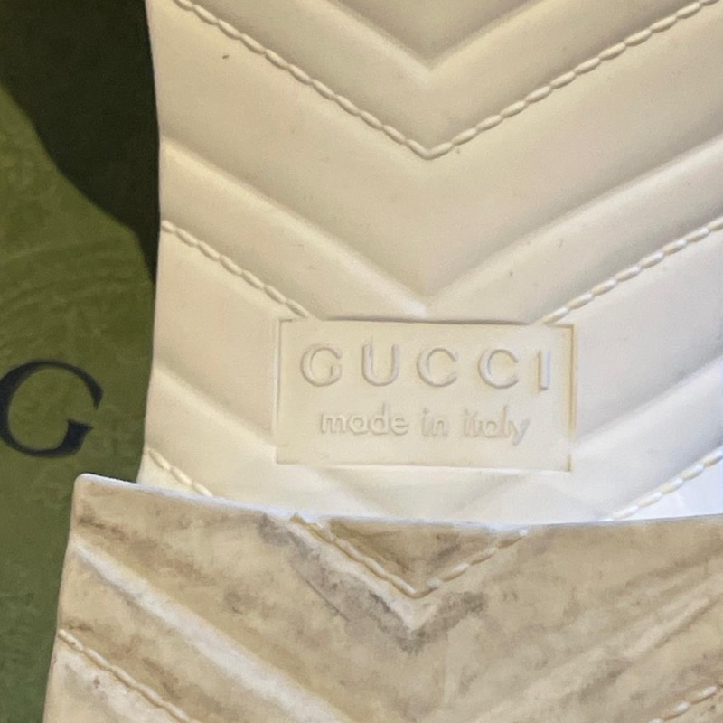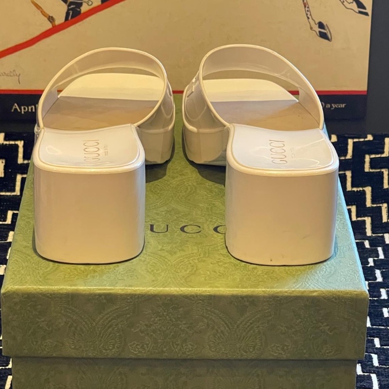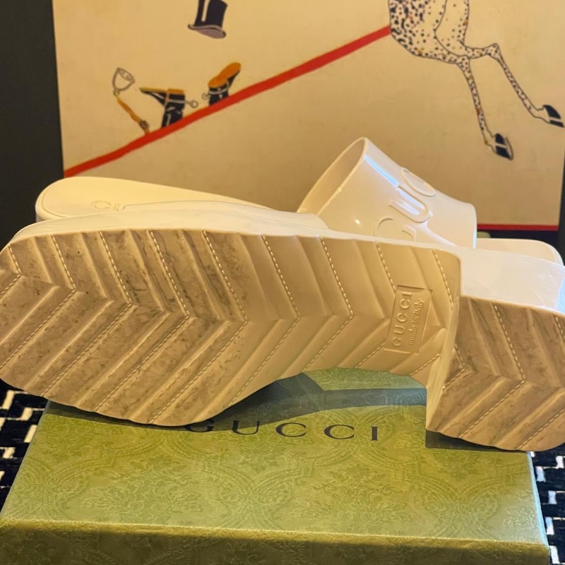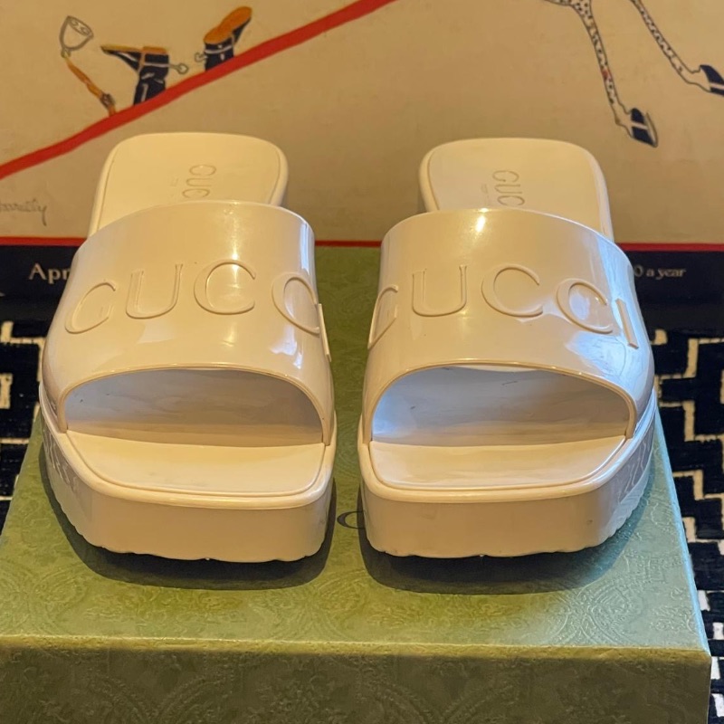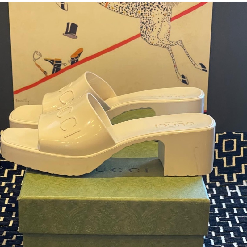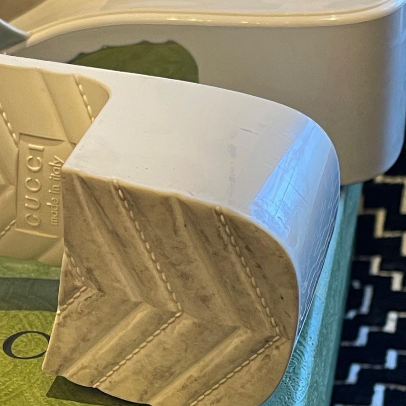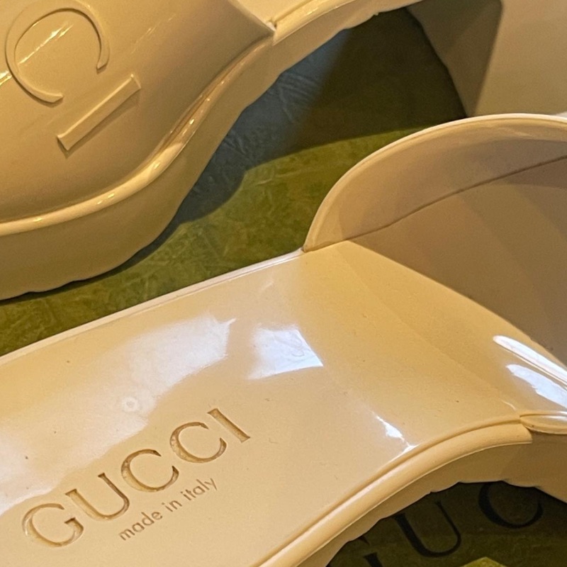Gucci cream coloured rubber mules with raised Gucci lettering