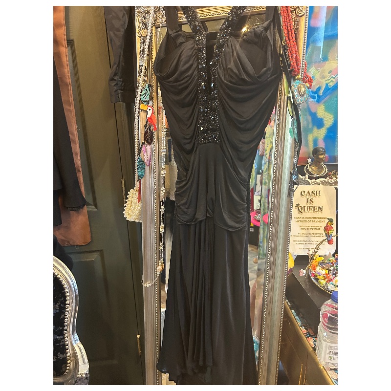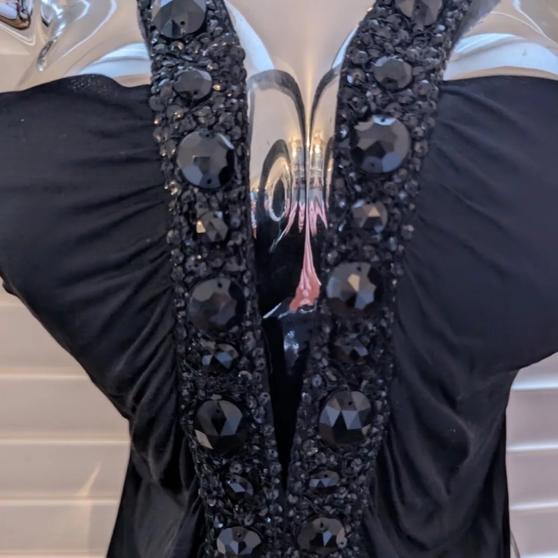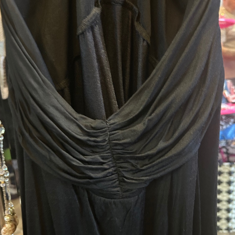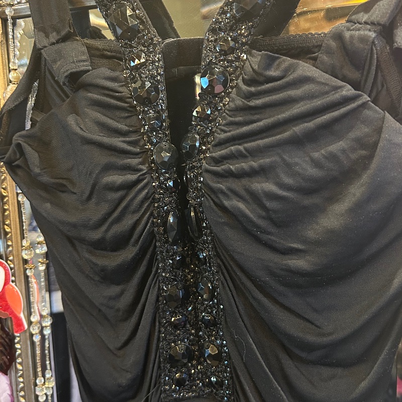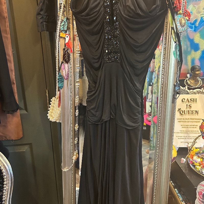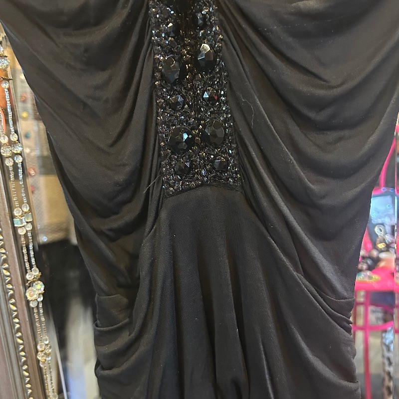 This dress is backless and has ruched areas and beaded front and straps. The fabric is stretchy and will fit size 10-14