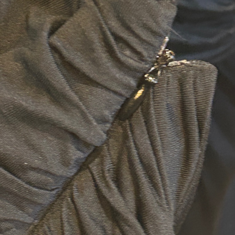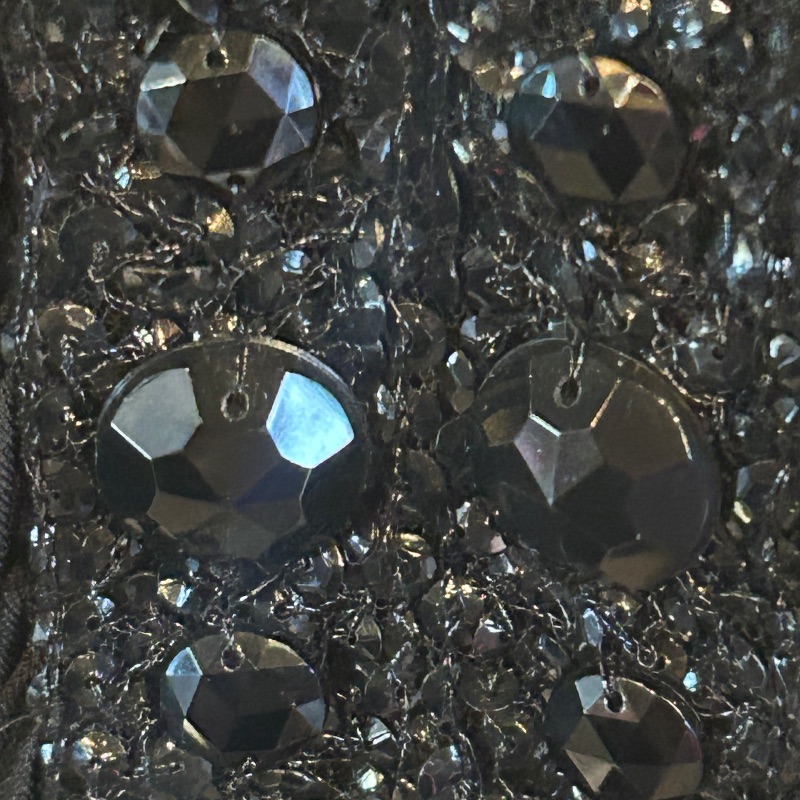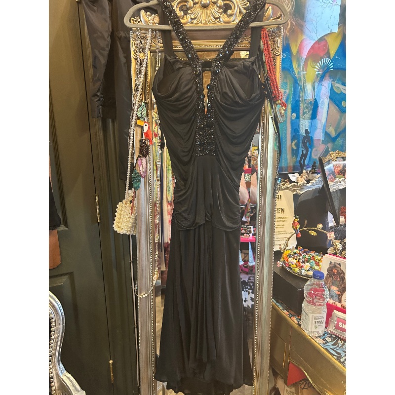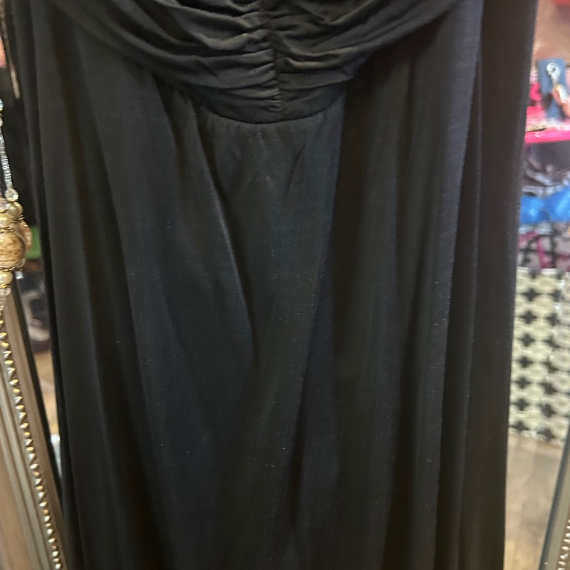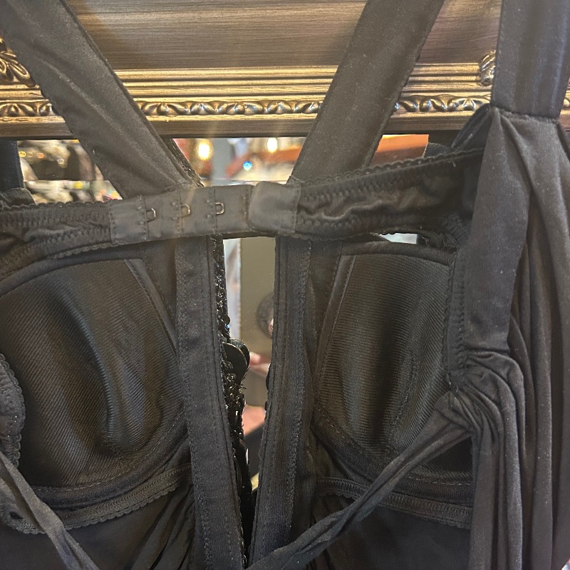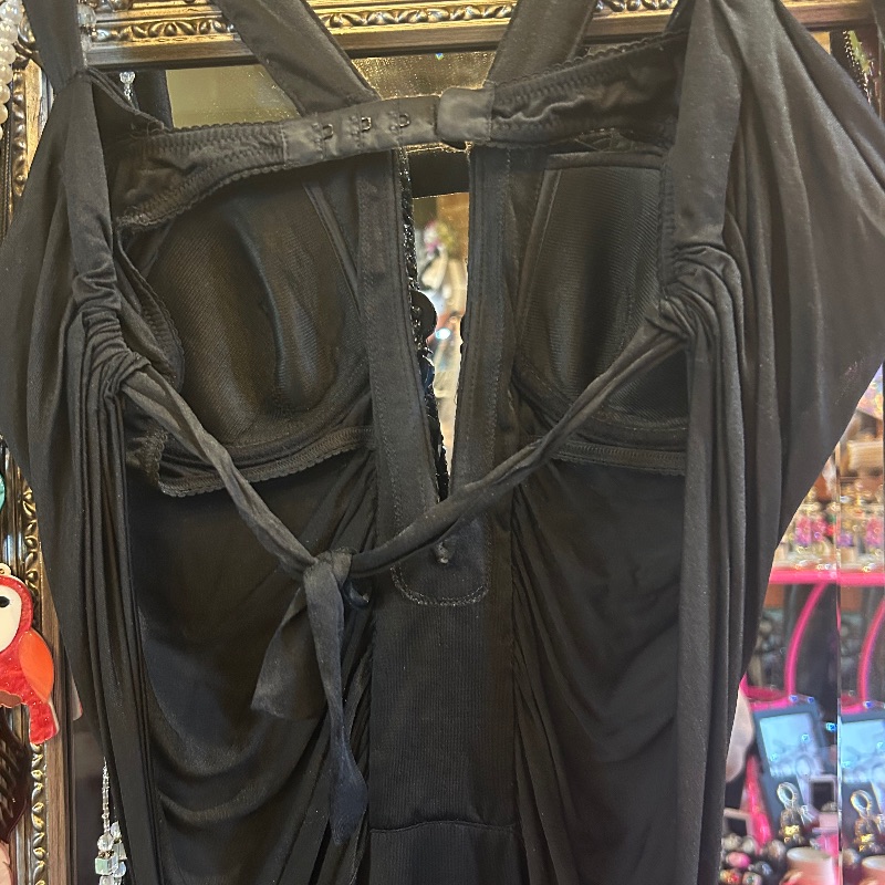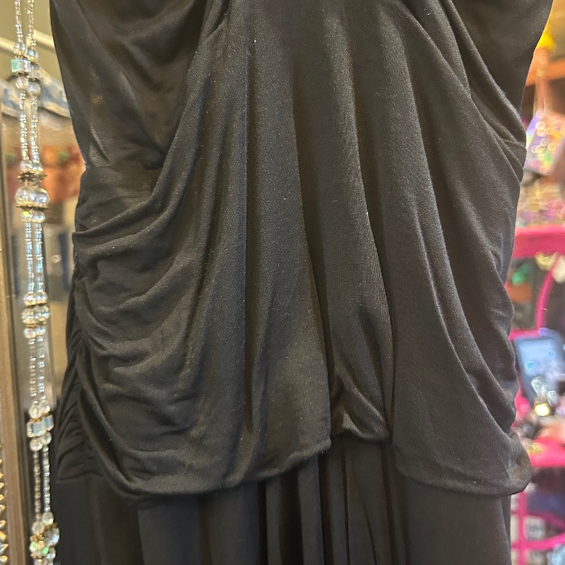This dress is backless and has ruched areas and beaded front and straps. The fabric is stretchy and will fit size 10-14