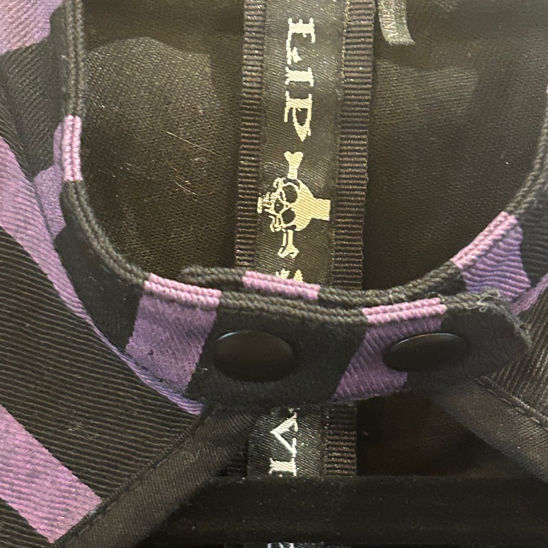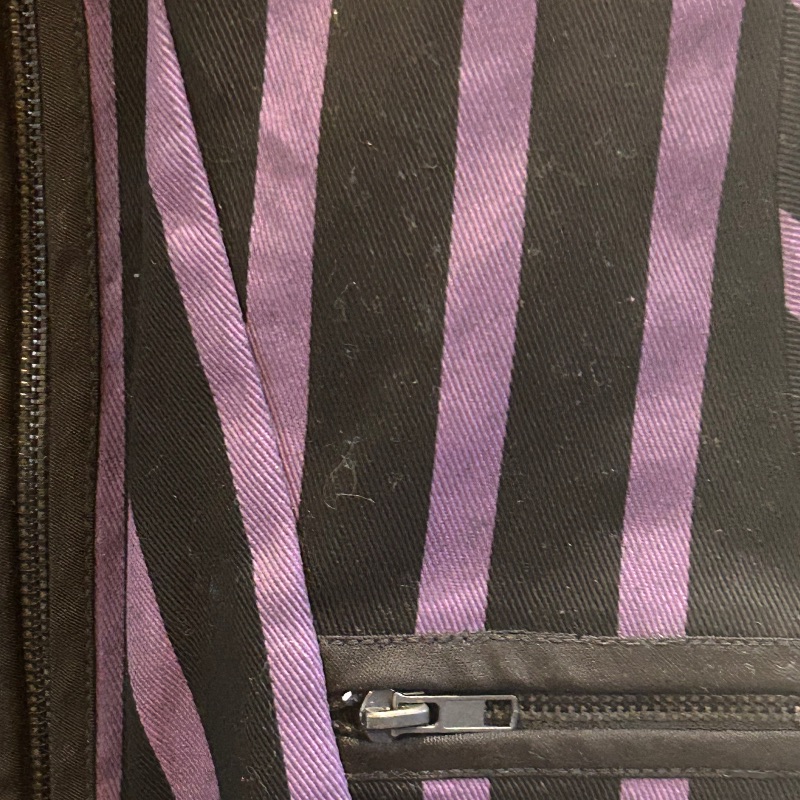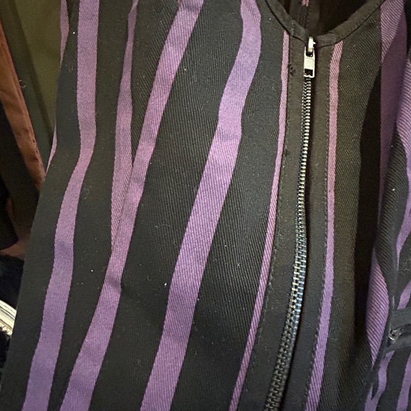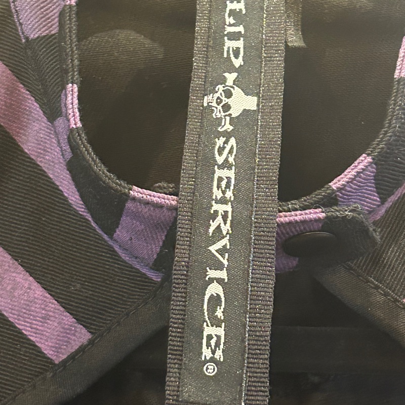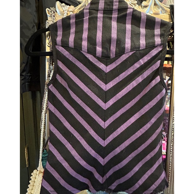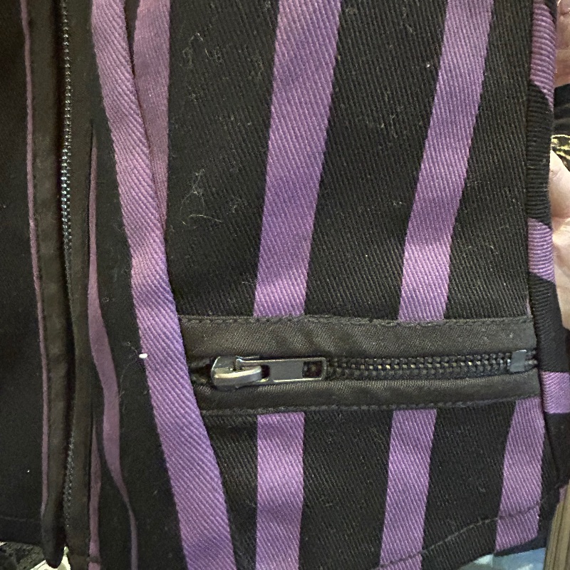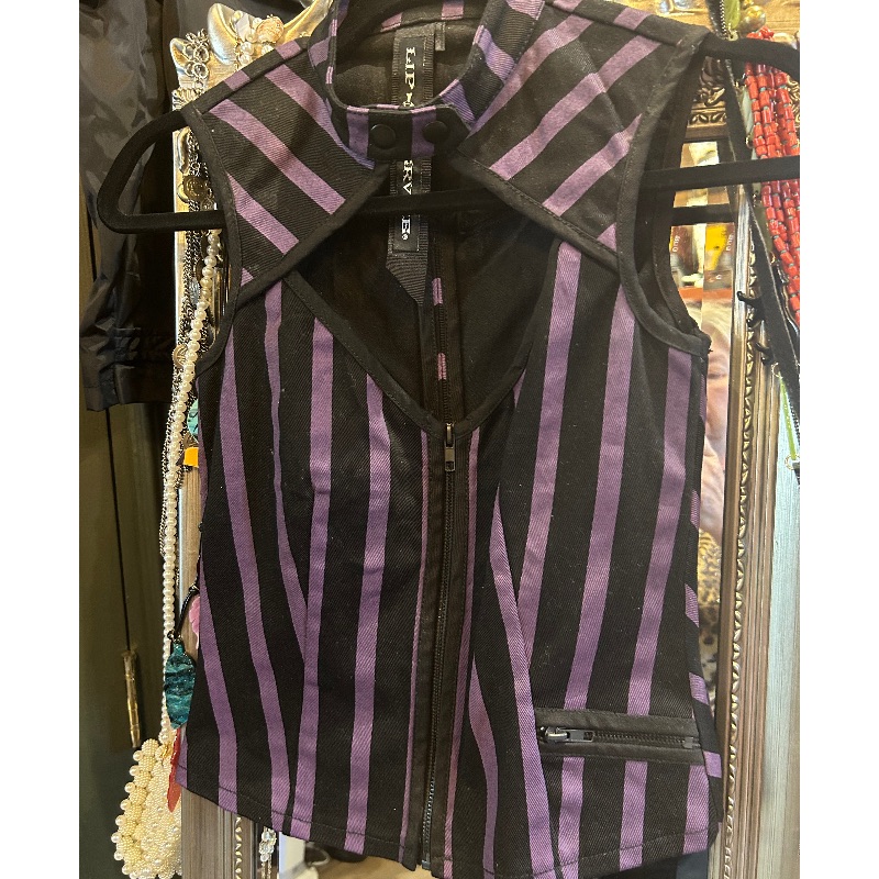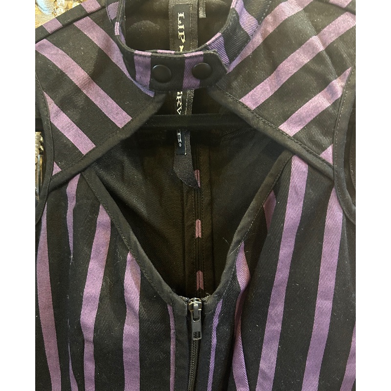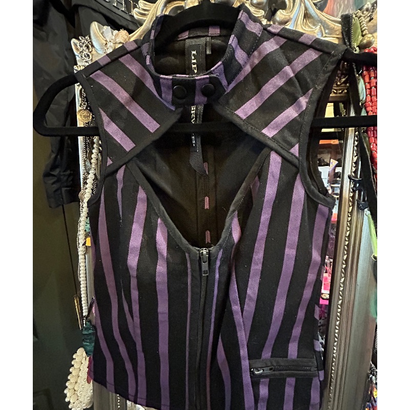 Lip Servize top in purple & black stripe. Full zip and keyhole front with one zip pocket.
