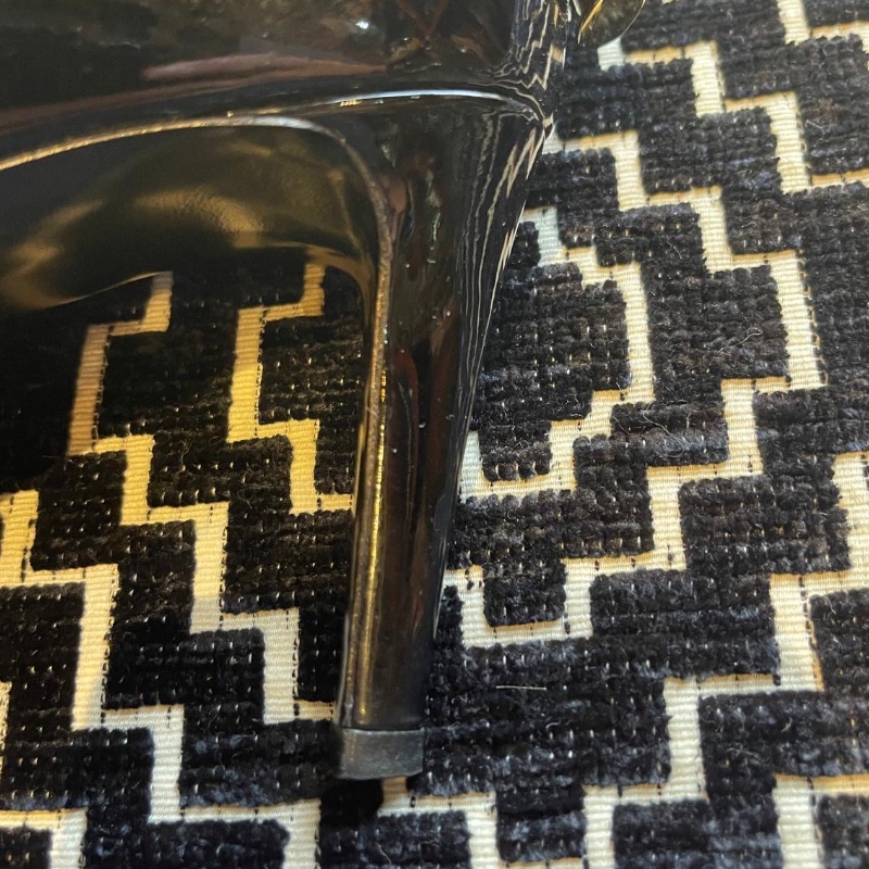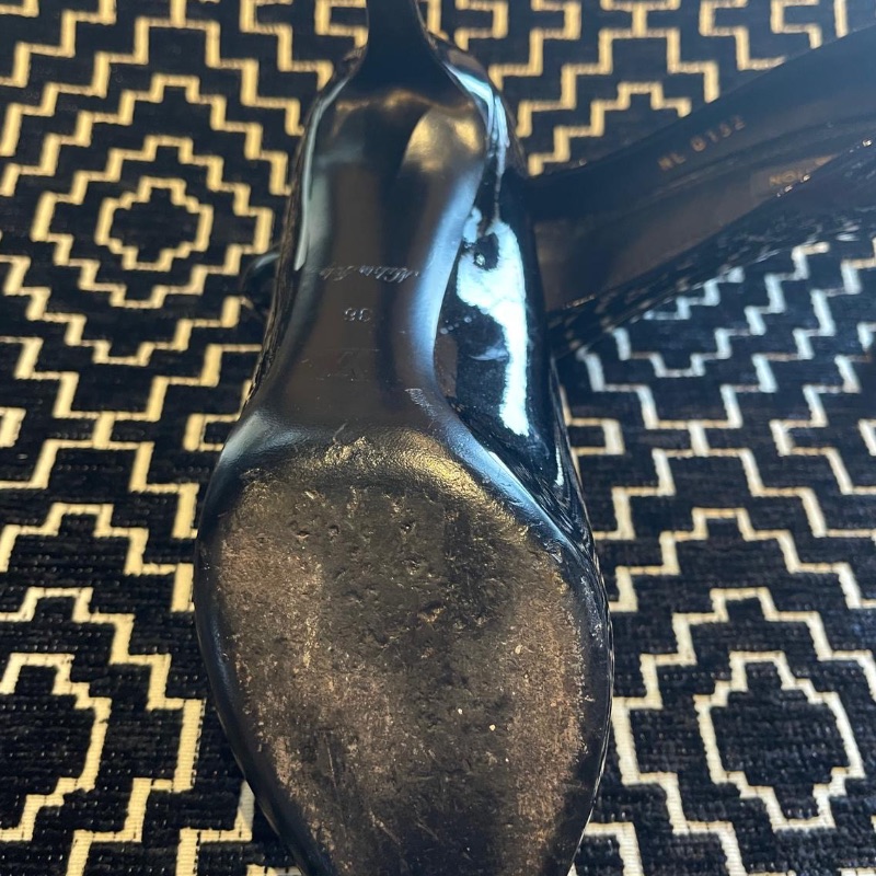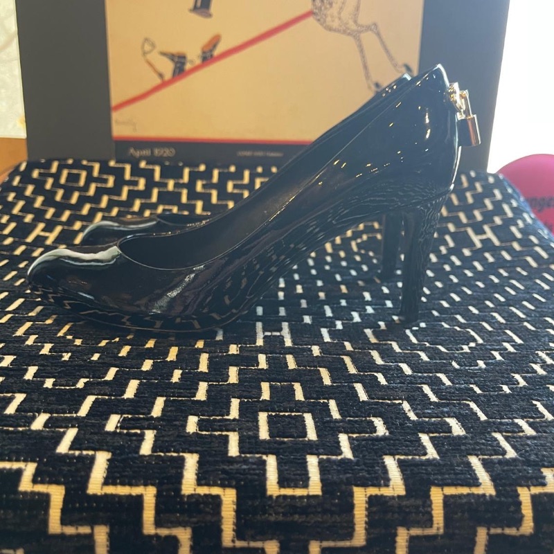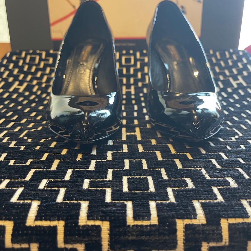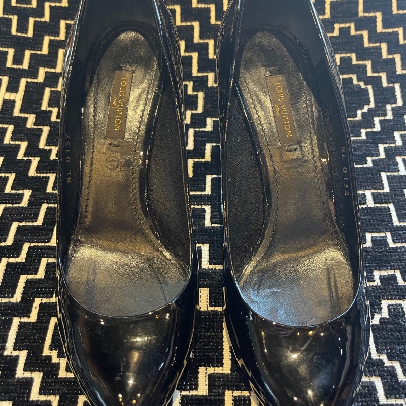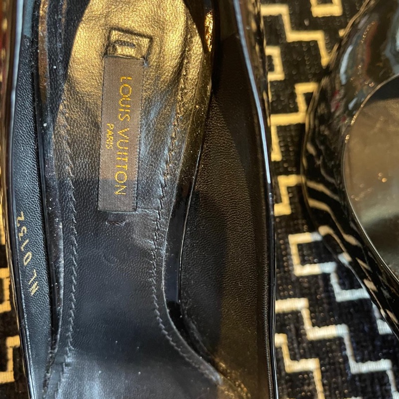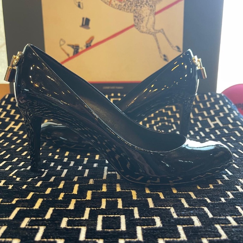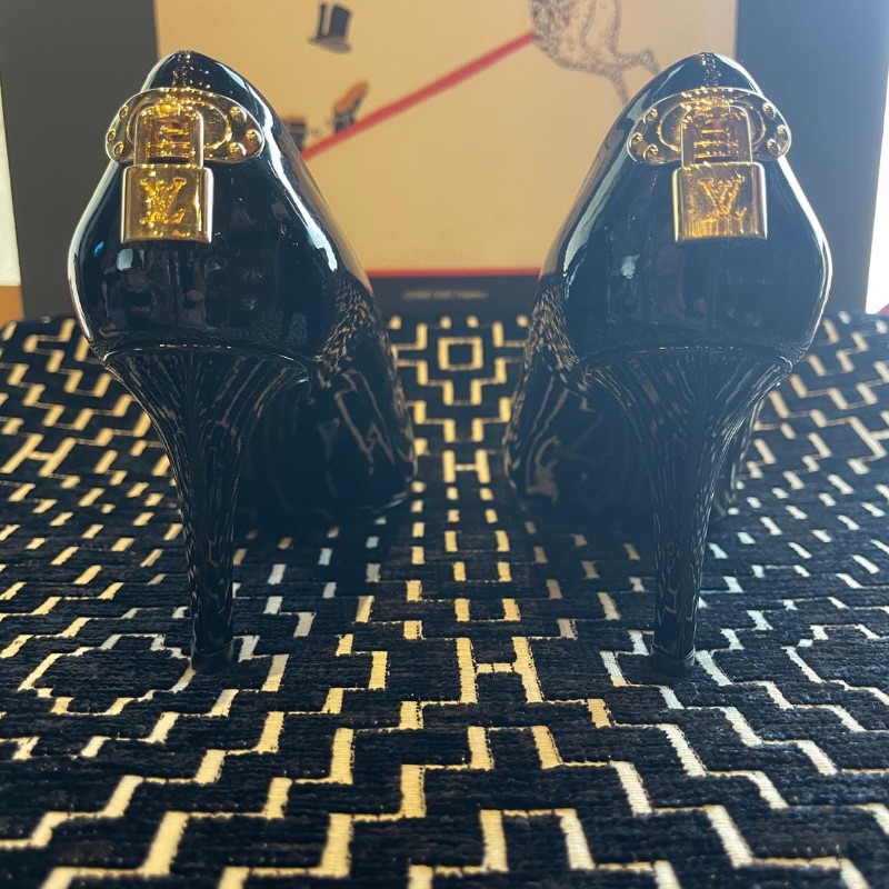 Louis Vuitton black patent leather court shoes with gold coloured padlock and LV emblem on the back. UK size 3. Shoes are in very good preloved condition and have 3” heels. No box but will send in a box.