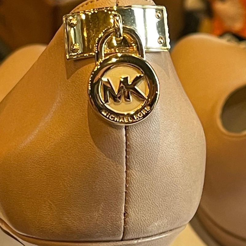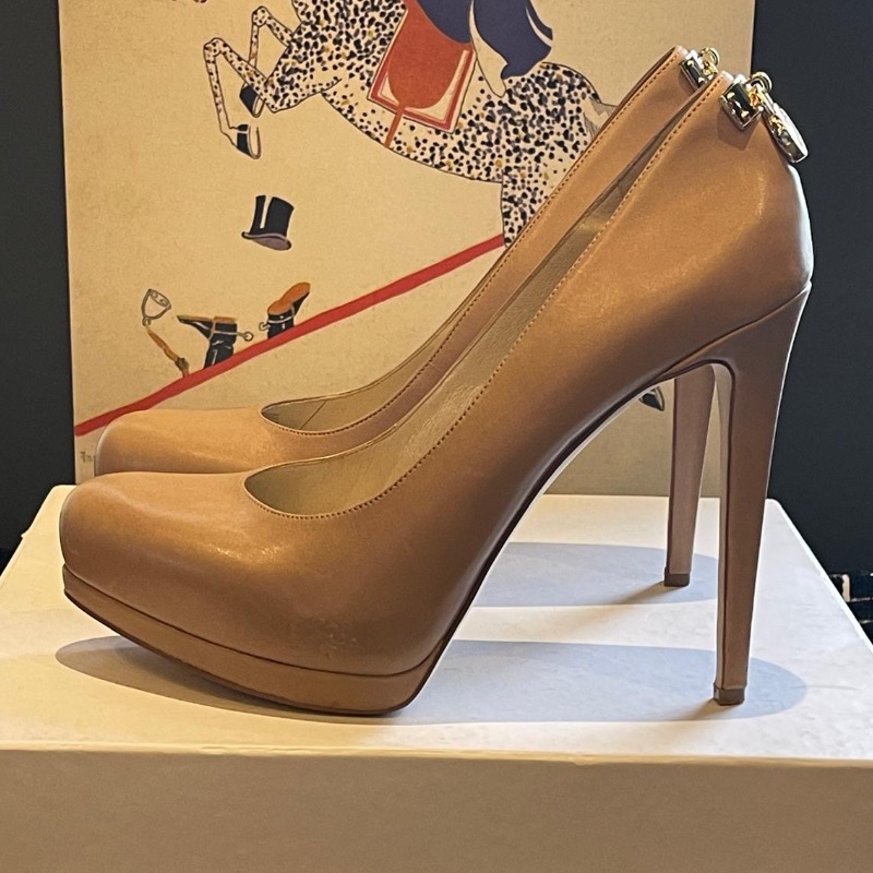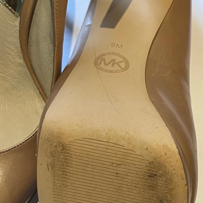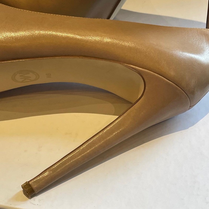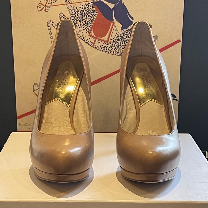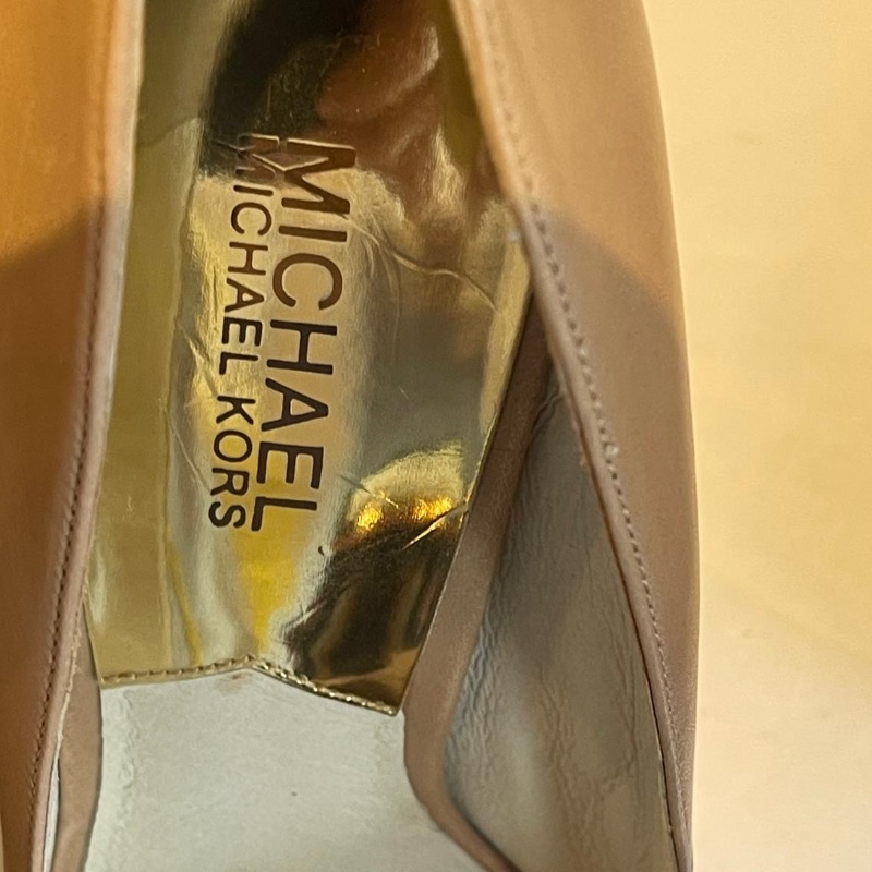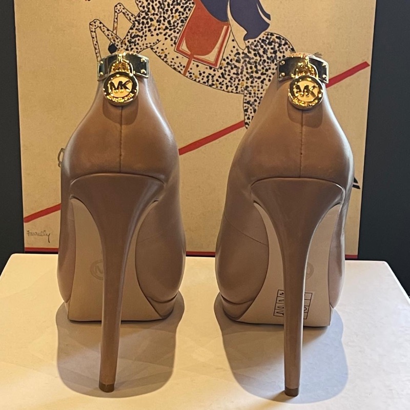 Michael Kors high heel courts with gold coloured logo metalwork at the back. In dark beige leather, these neutral colours will match most outfits