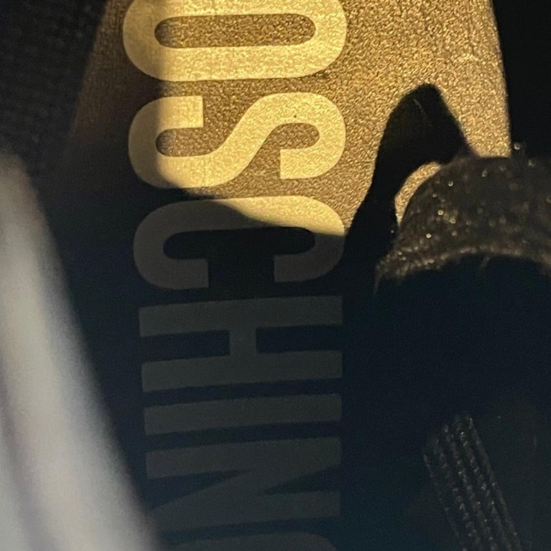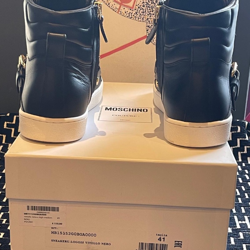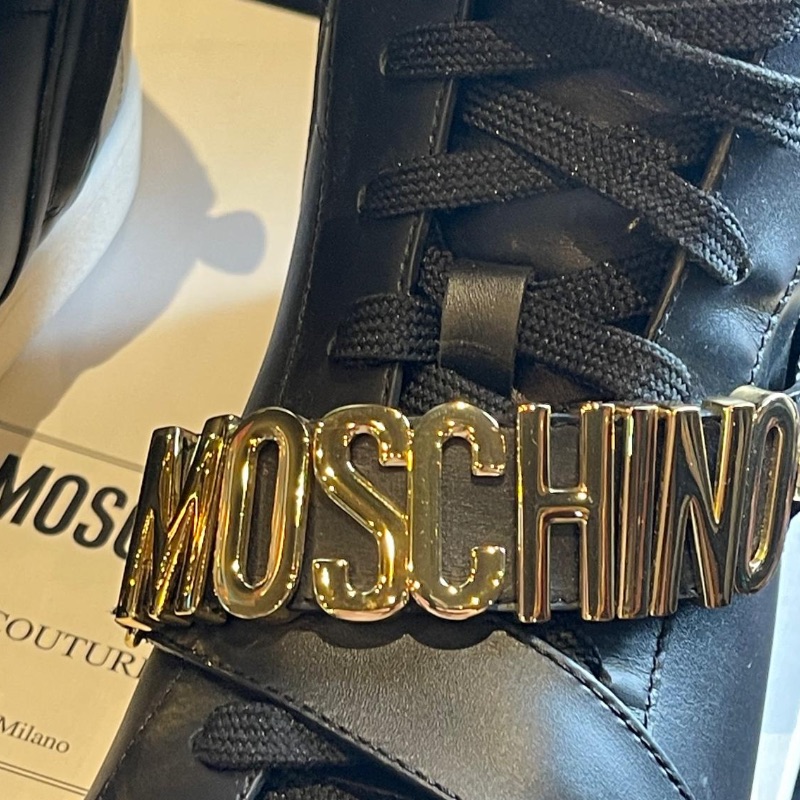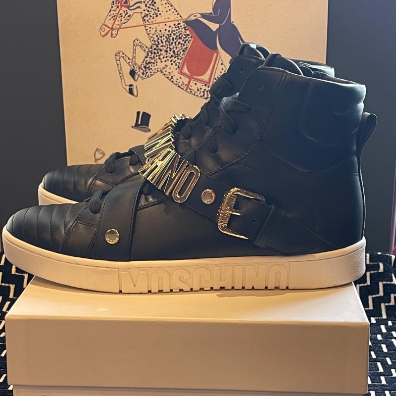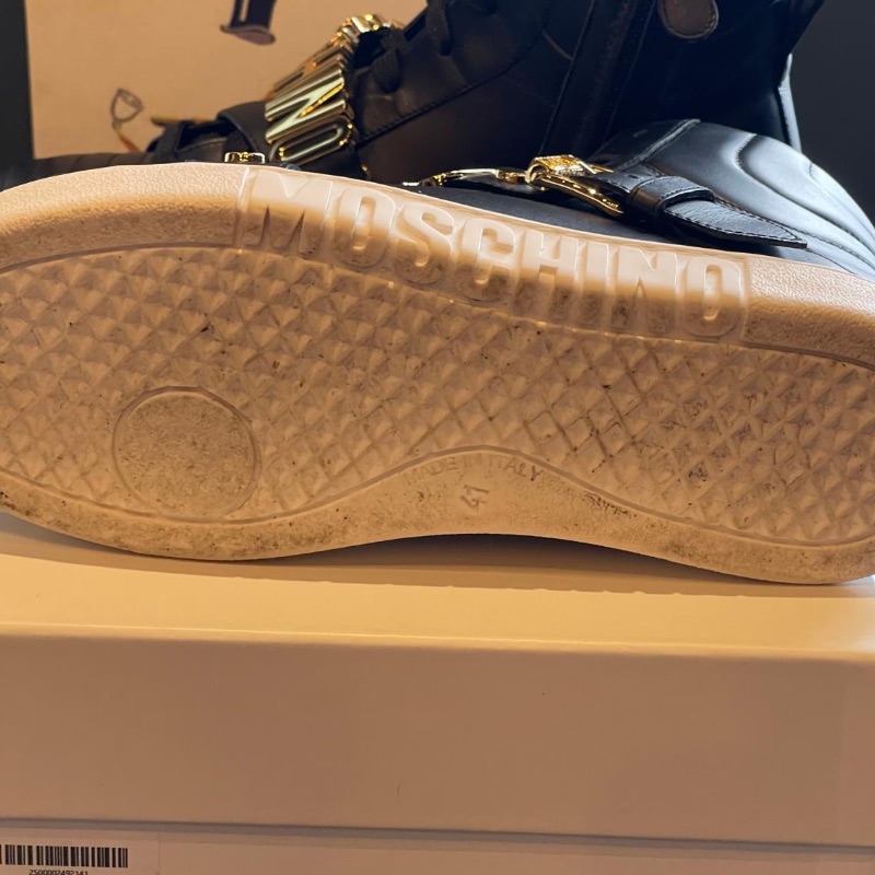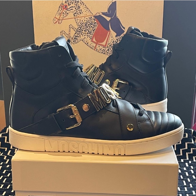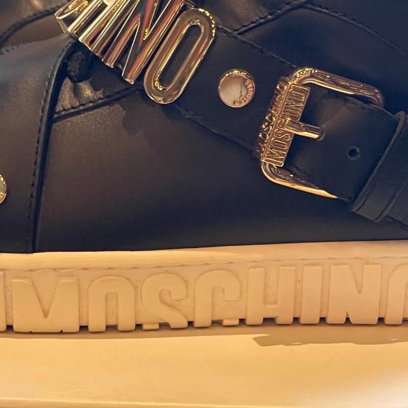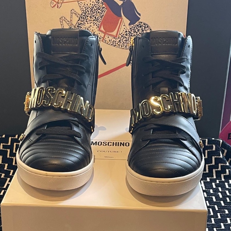 Another rare find! Moschino leather high top sneaker boot with gold coloured metal letters and Moschino logo sides. Inner zips These are so cool