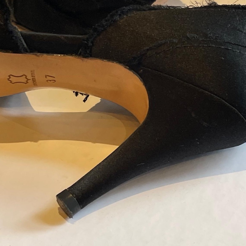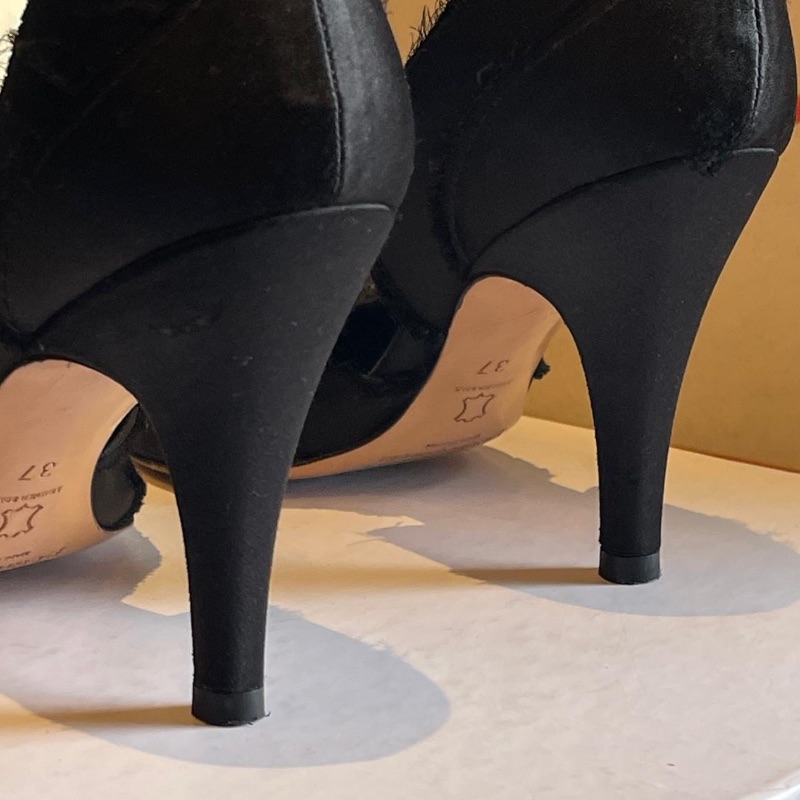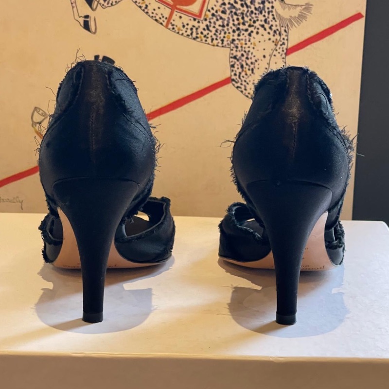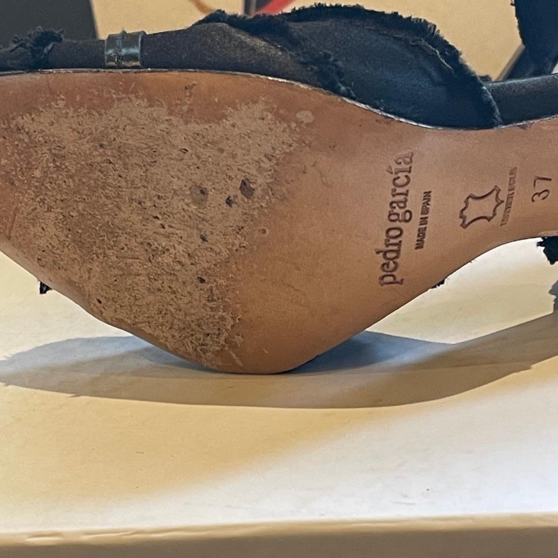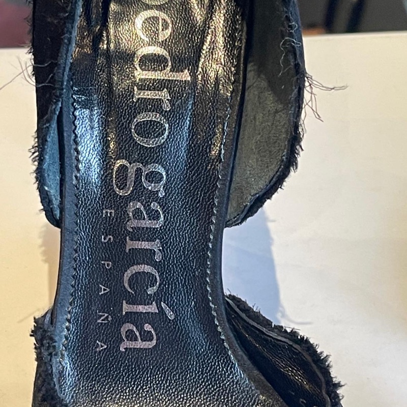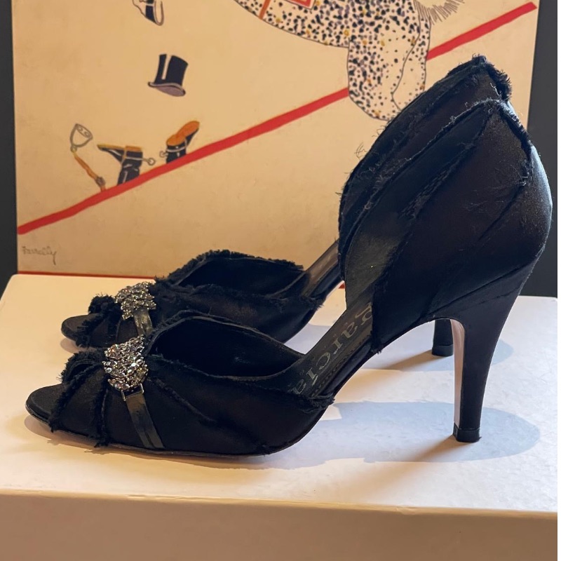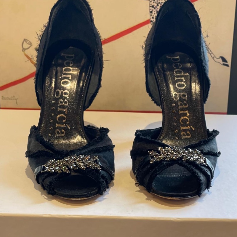 Dainty Peeptoe designer shoes by Pedro Garcia. These are simply gorgeous with raw edge edging, soft satin body and Diamante band across the front. Leather soles