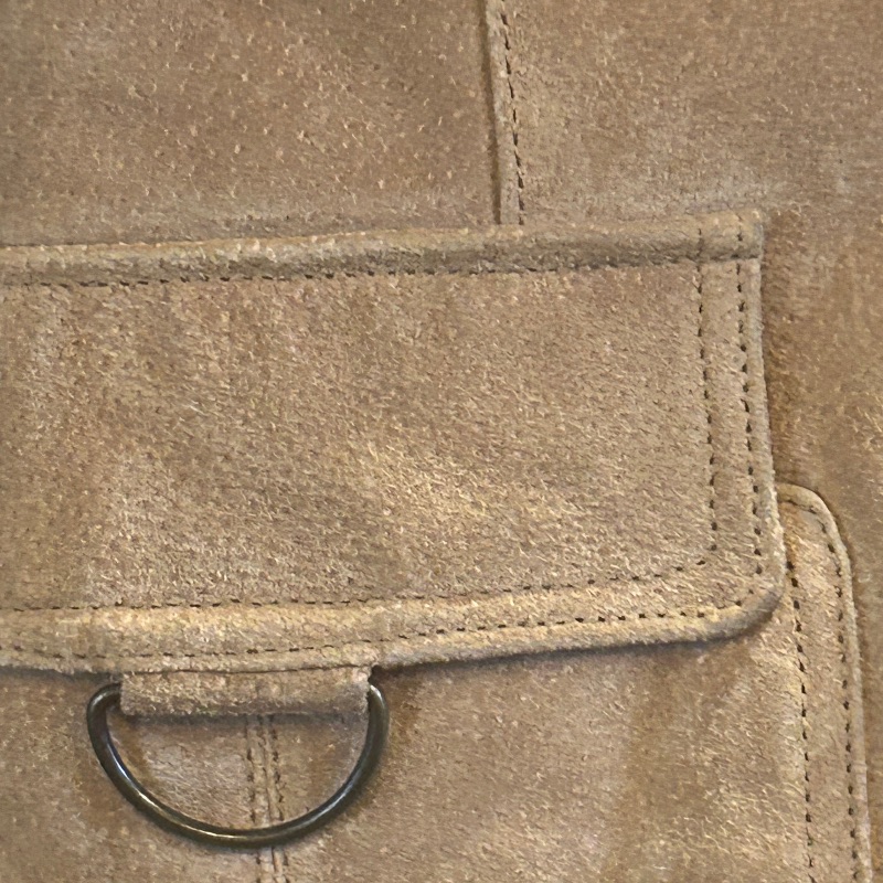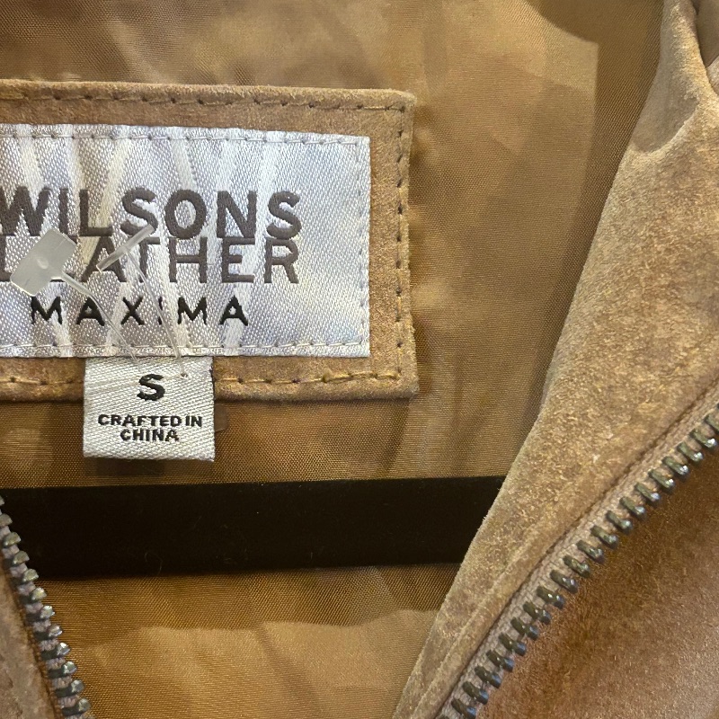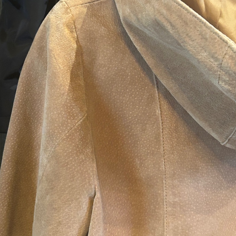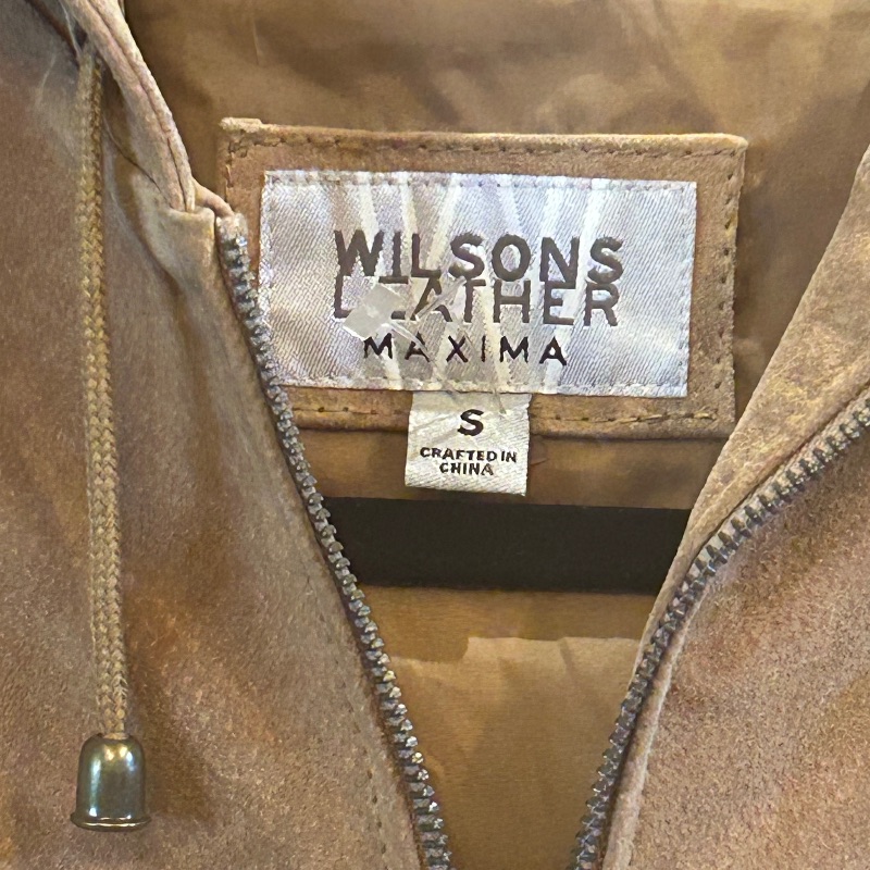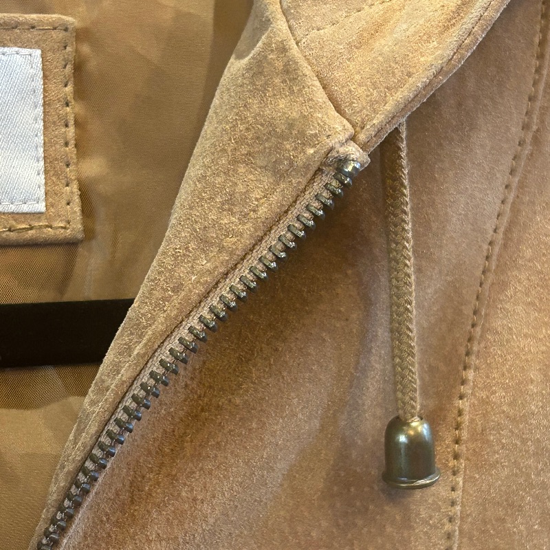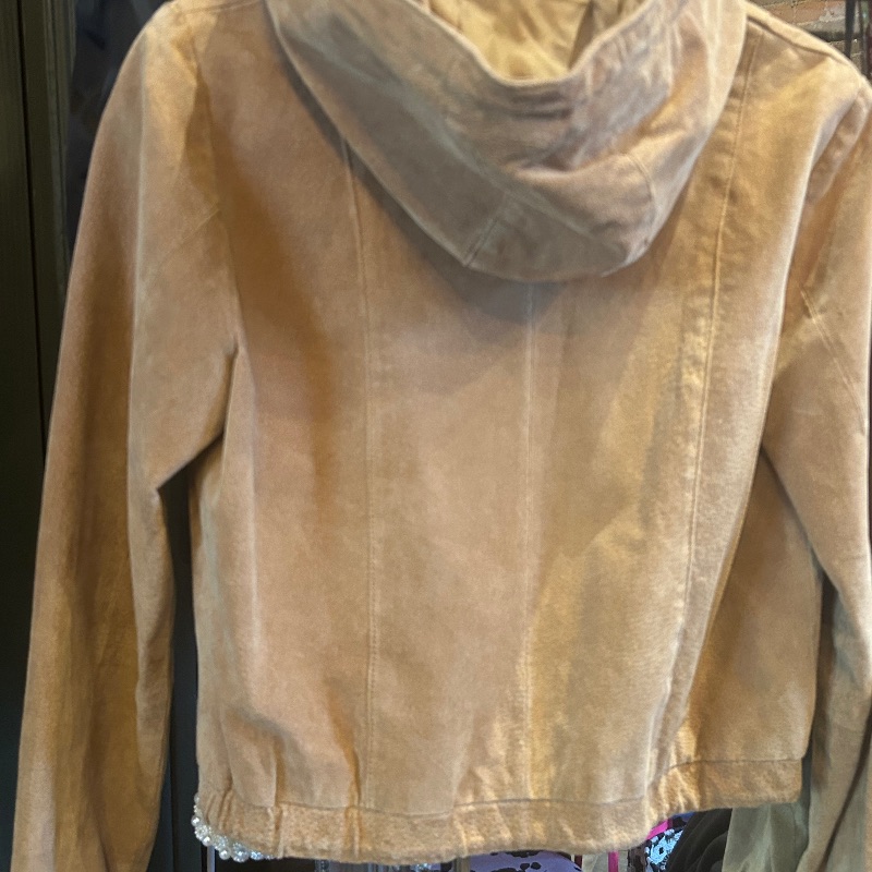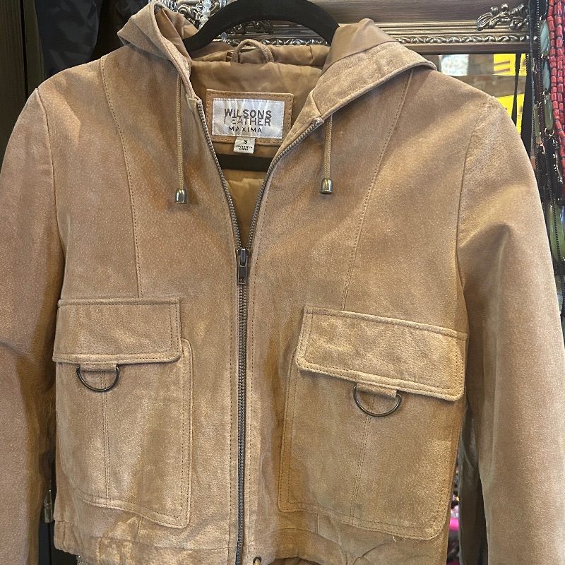 Tan 100% suede crop hooded jacket by Wilson’s Leather