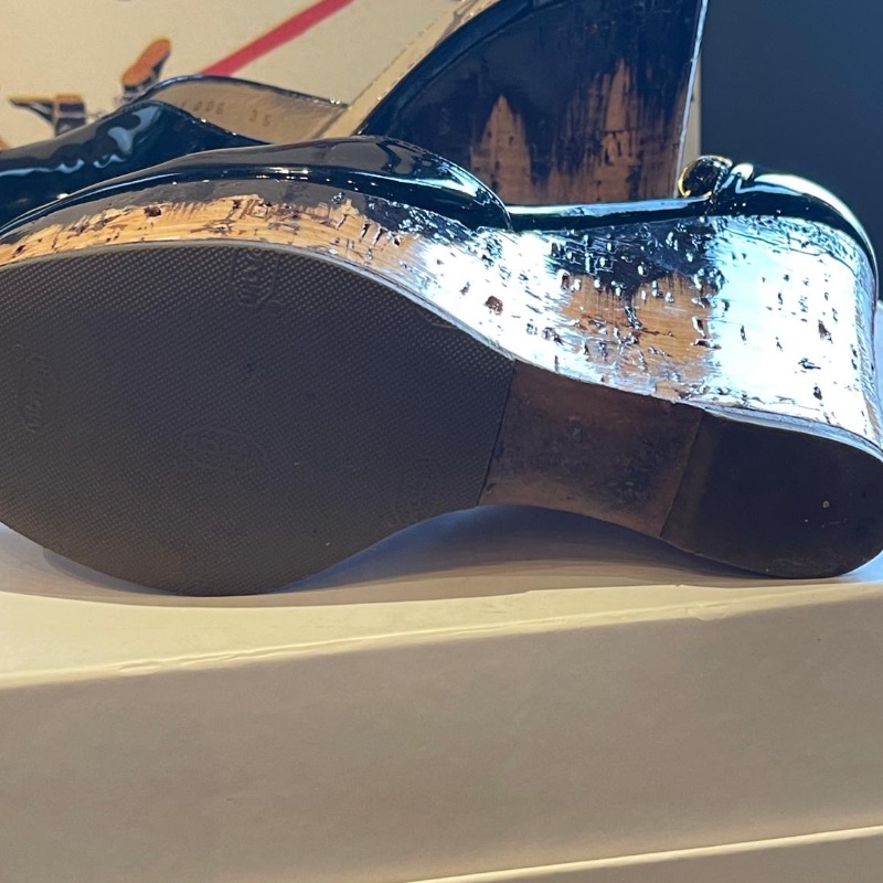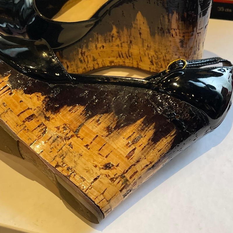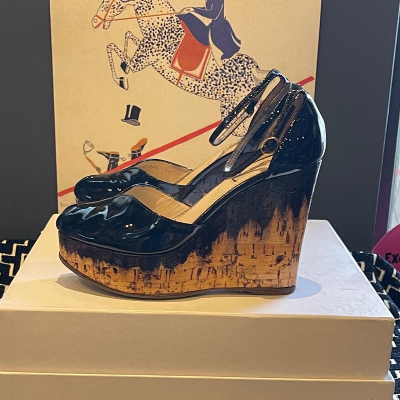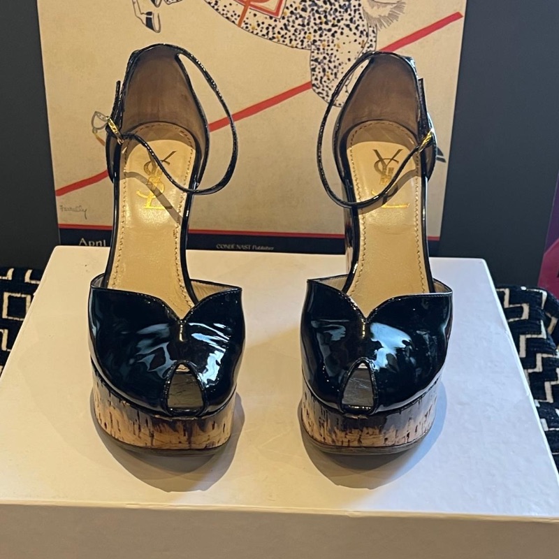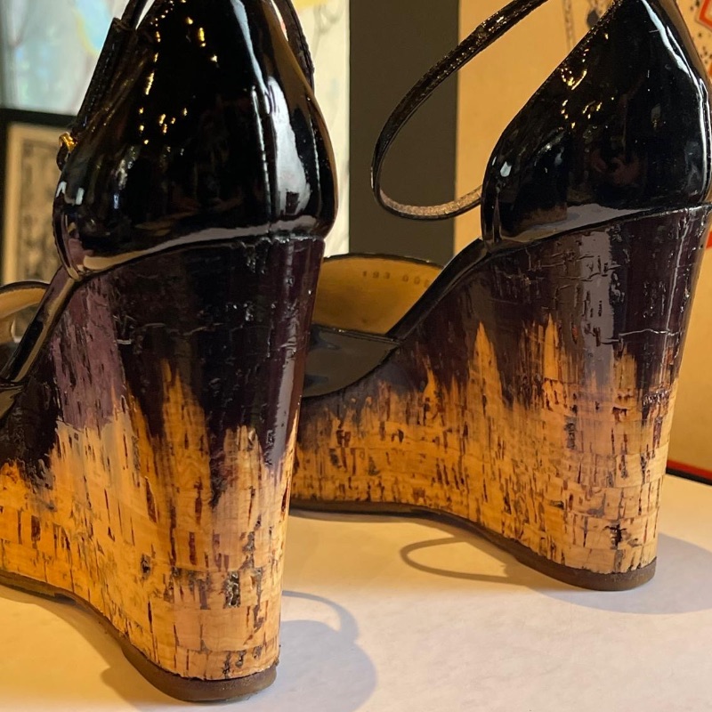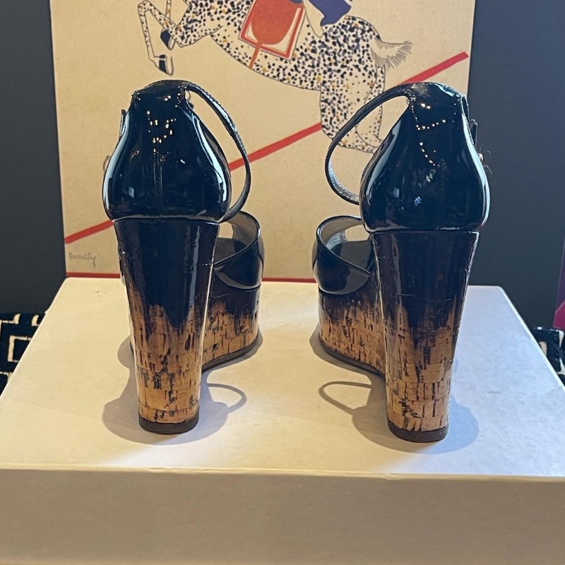 YSL patent Peeptoe wedge for the more smaller foot. These are truly amazing, with the black patent looking as though it’s running down the coated cork wedge. Pretty sure these are vintage but don’t have any details.